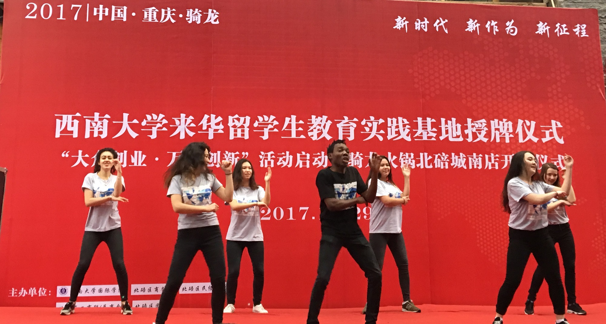 学校与重庆骑龙饮食文化责任有限公司共建来华留学生教育实践基地,掀开了校企合作的新篇章,是继在宗申产业集团、朝阳小学和学校食品科学学院设立来华留学生教育实践基地后,学校在校外针对来华留学生建立的第三个教育实践基地。 来自坦桑尼亚、俄罗斯、哈萨克斯坦等国的学生带来了精彩的歌舞表演。