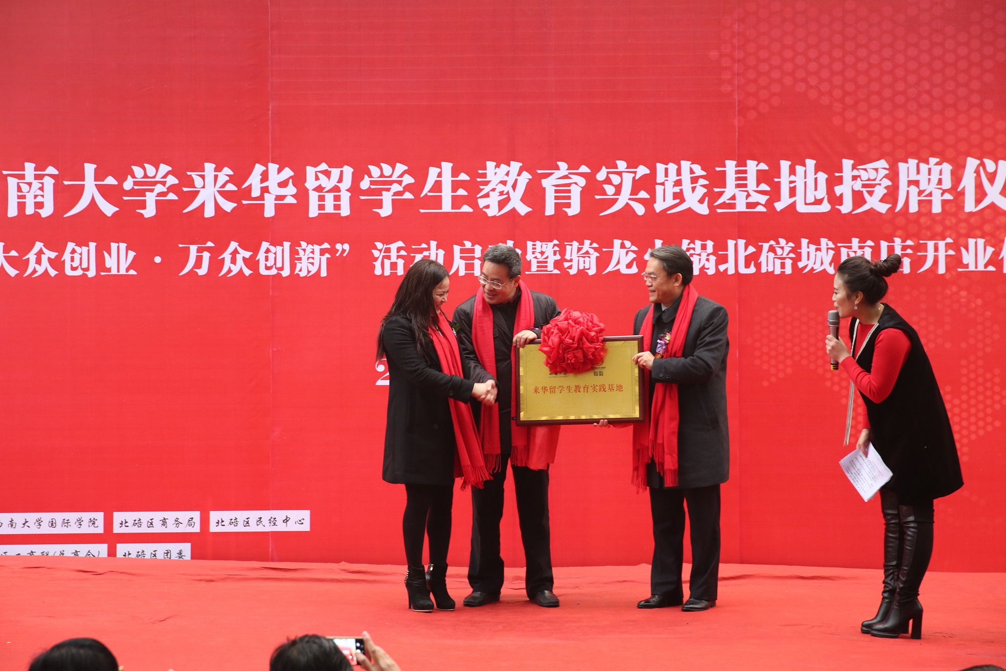 12月29日上午,学校“来华留学生教育实践基地”授牌仪式在重庆骑龙饮食文化责任有限公司举行,北碚区人民政府副区长赵祺,学校伟的国际1946bv党总支书记刘猛共同为公司董事长任鸿海秀女士授牌。