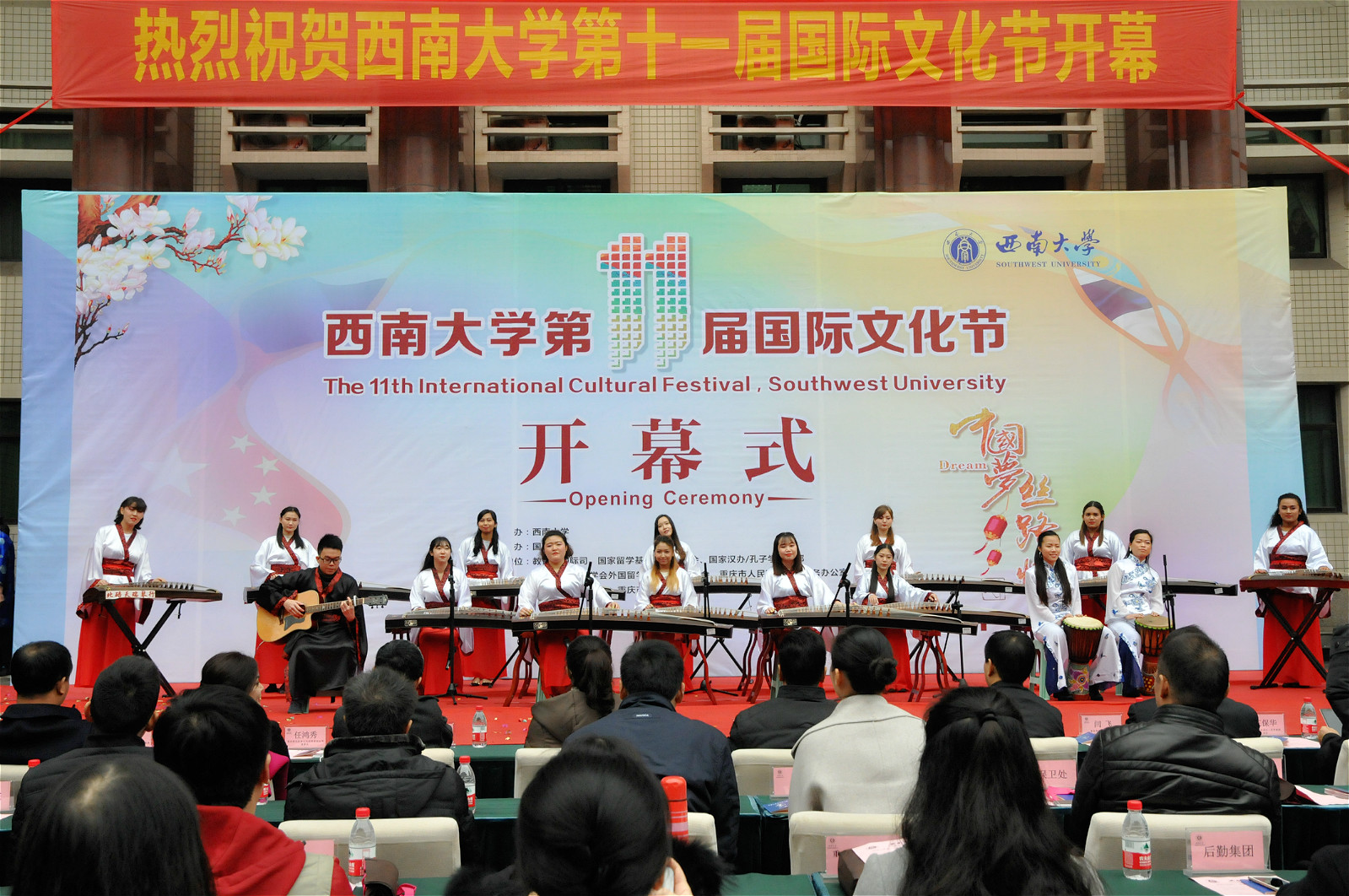 12月7日下午,学校第十一届国际文化节在田家炳书院前开幕。此次国际文化节以“中国梦 丝路情”为主题,积极响应习近平总书记倡导推动的“一带一路”战略,努力营造包容和谐的文化氛围。出席文化节开幕式的嘉宾有重庆市人民政府外事侨务办公室、重庆市公安局出入境管理局、北碚区公安分局、加拿大驻重庆总领事馆有关领导,副校长靳玉乐教授、学校相关职能部门及部分学院负责人。