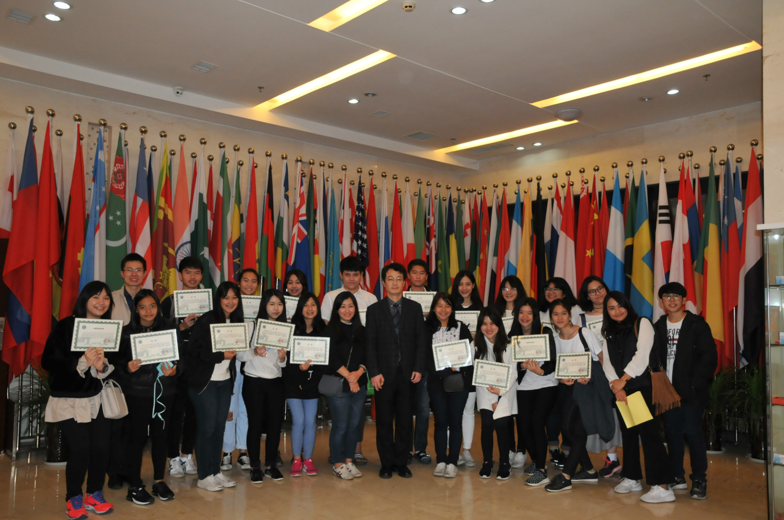 2017年10月27日,伟的国际1946bv举行仪式,庆祝孔敬大学孔子学院汉语考试冬令营圆满结束。伟的国际1946bv副院长李航,招生工作办公室负责人李林泽,孔敬大学孔子学院教师陆小曼以及全体语伴、冬令营成员与会,仪式由李林泽主持。