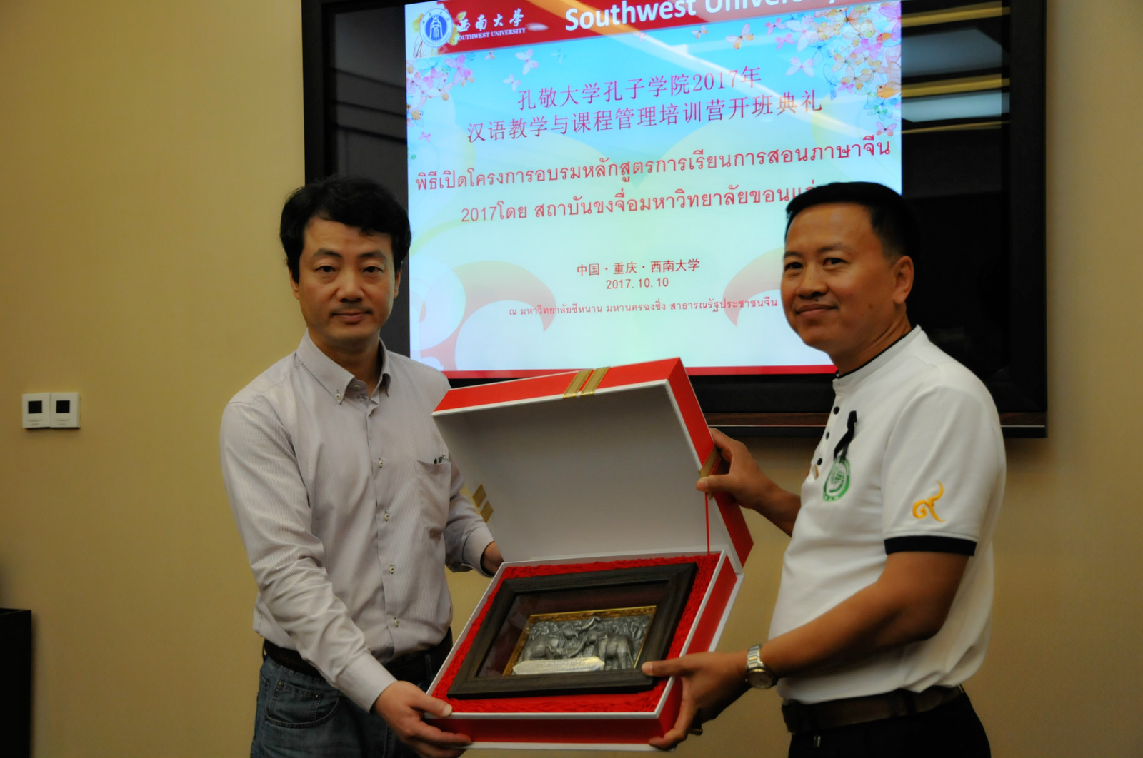 10月10日上午,泰国孔敬大学孔子学院2017年汉语教学与课程管理培训营在我院紫云楼签约室顺利开营。副院长李航、孔敬大学孔子学院中方院长胡琳、招生办公室主任李林泽以及来自泰国各职业院校的18名校长、副校长和教师参加了此次开营典礼。