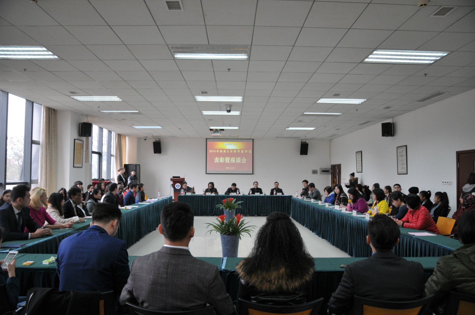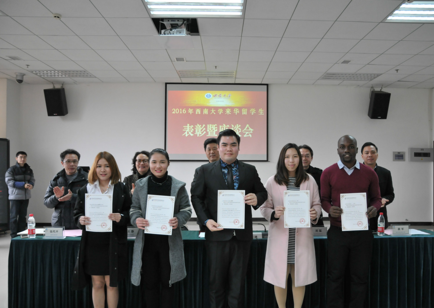 2016年12月29日,学校2016年优秀来华留学生表彰暨座谈会在伟的国际1946bv317会议室举行。副校长靳玉乐教授、教务处张代平副处长,伟的国际1946bv王静院长、刘猛书记,以及经济管理学院、教育学部、政治与公共管理学院、文学院、新闻传媒学院、伟的国际1946bv等留学生培养单位的导师、辅导员代表济济一堂,与获奖学生代表一起出席会议。