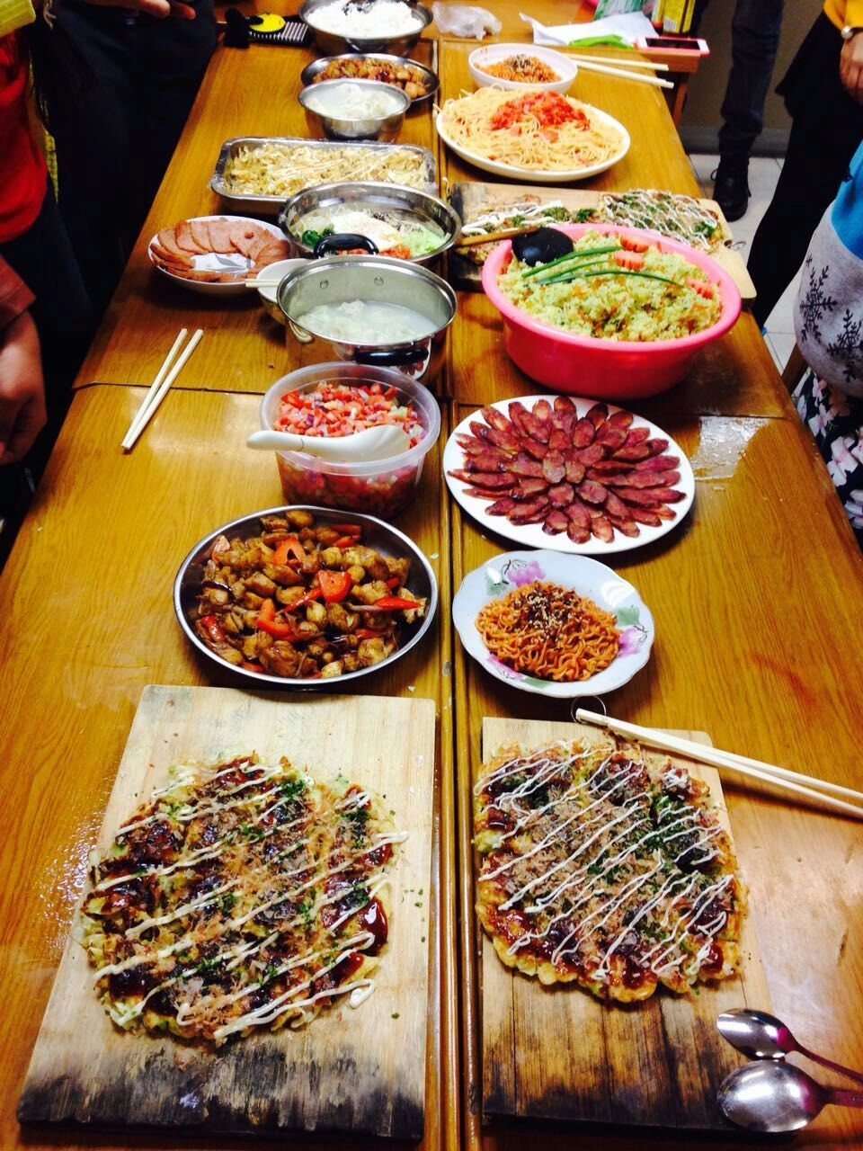 经过各位师生的精心制作,一道道异国美食铺满了整个桌子,芳香四溢,有:香喷喷的意大利面、金灿灿的斯里兰卡特色炒饭、酥脆脆的番茄炸鸡、热腾腾的韩国拌饭、香甜甜的火龙果肉片、红艳艳的火鸡炒面、黄橙橙的芝士泡菜、香脆可口的什锦烧、五颜六色的蔬菜沙拉……五花八门,应有尽有,让人垂涎欲滴。