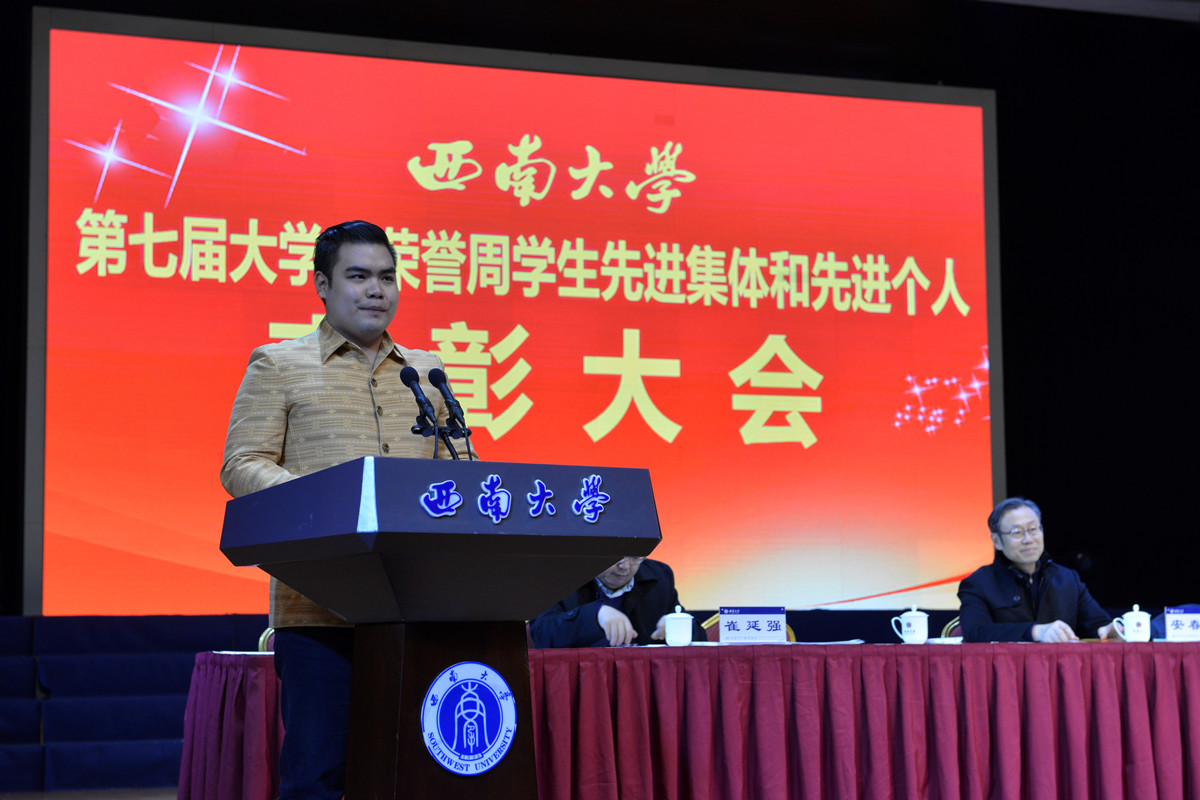 12月15日下午3点,荣获2015-2016学年度优秀来华留学生奖学金的留学生代表参加了学校第七届大学生荣誉周学生先进集体和先进个人表彰大会,泰国学生罗俊勇在大会上发言。王静院长、学生工作办公室负责人和30余名获奖留学生代表出席会议。