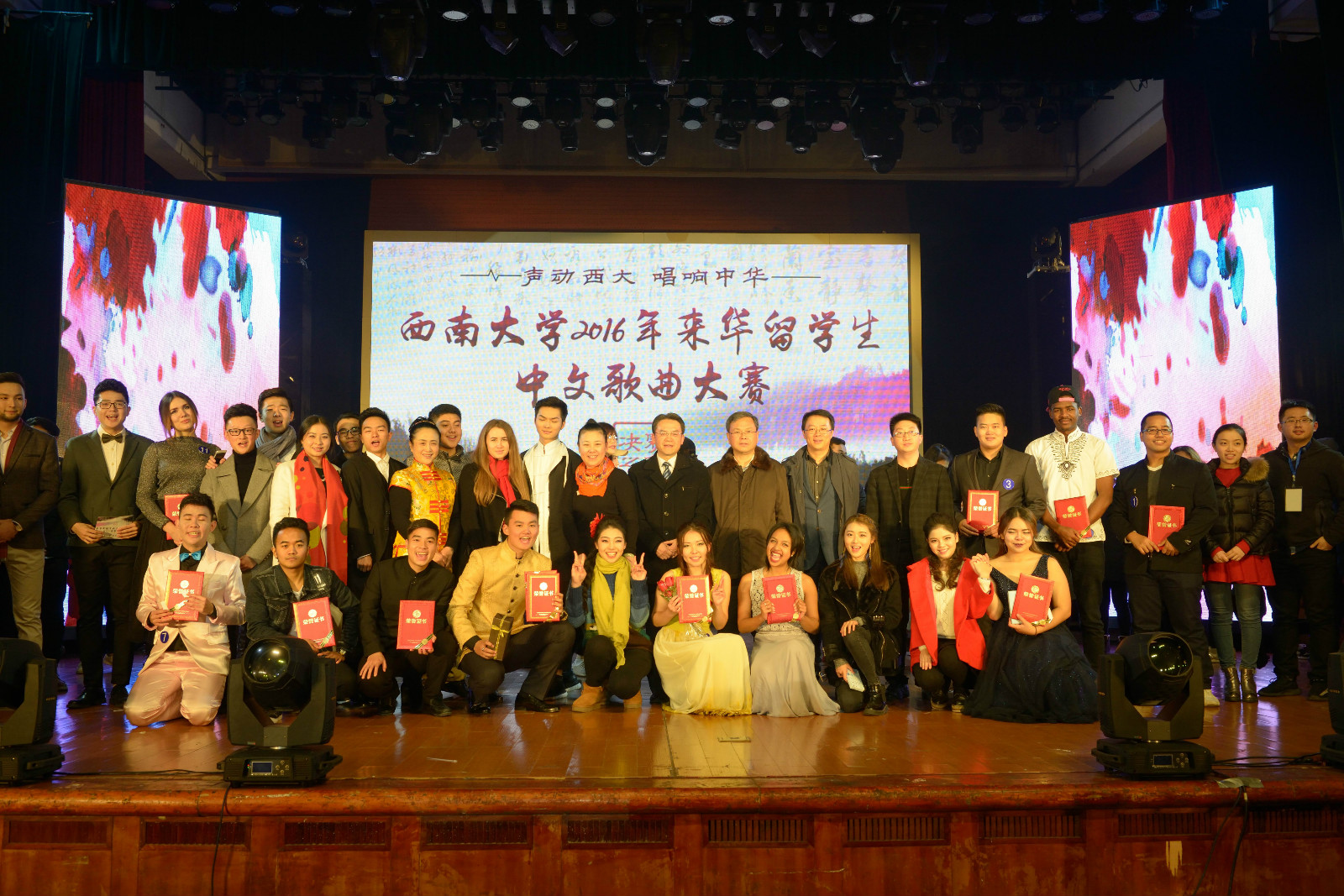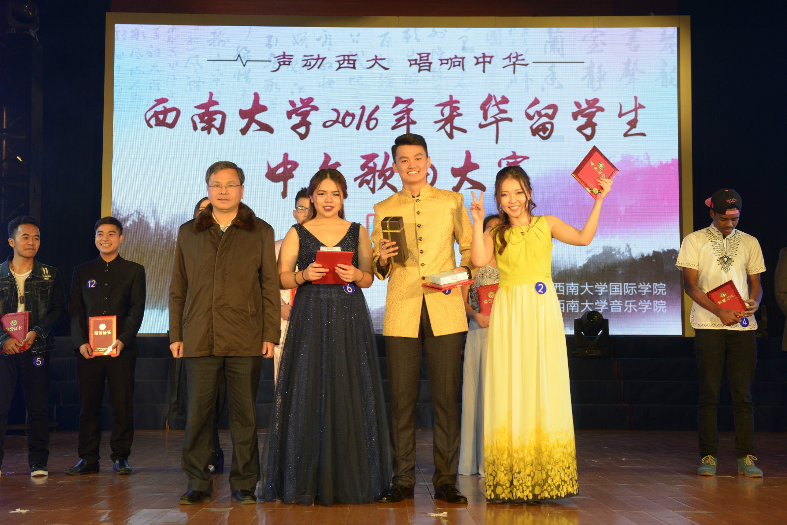 12月1日晚,由伟的国际1946bv主办、音乐学院协办的“声动西大,唱响中华” 2016年来华留学生中文歌曲大赛(决赛)在光大礼堂精彩上演。校长助理苏桂发教授、重庆市教委国际合作与交流处副处长李斌、北碚区公安分局副支队长王贞学,以及学校伟的国际1946bv、国际合作与交流处、学生处、教育学部、音乐学院、经济管理学院等单位领导应邀出席比赛并为获奖选手颁奖。