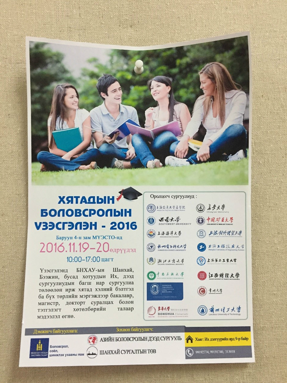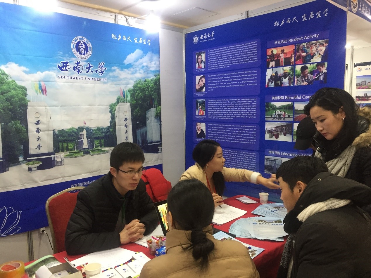 11月19日、20日,蒙古国2016年中国高等教育展正式举行。蒙古国工业部部长,认证部部长出席开幕式并讲话。在随后的教育展上,我校展位以“魅力西大 宜居宜学”为主题,以“西大蓝”为主题色,展布采用中蒙双语制作,配有蒙古在校生学习感想、最新校园风光图片,引起参展学生、家长的极大关注。在为期两天的展会上,数百学生前来就学校情况、申请程序、奖学金设置、校园生活等方面进行咨询。我校蒙古国合作高校领导教师、蒙古籍留学生校友等前来学校展位交流叙旧。