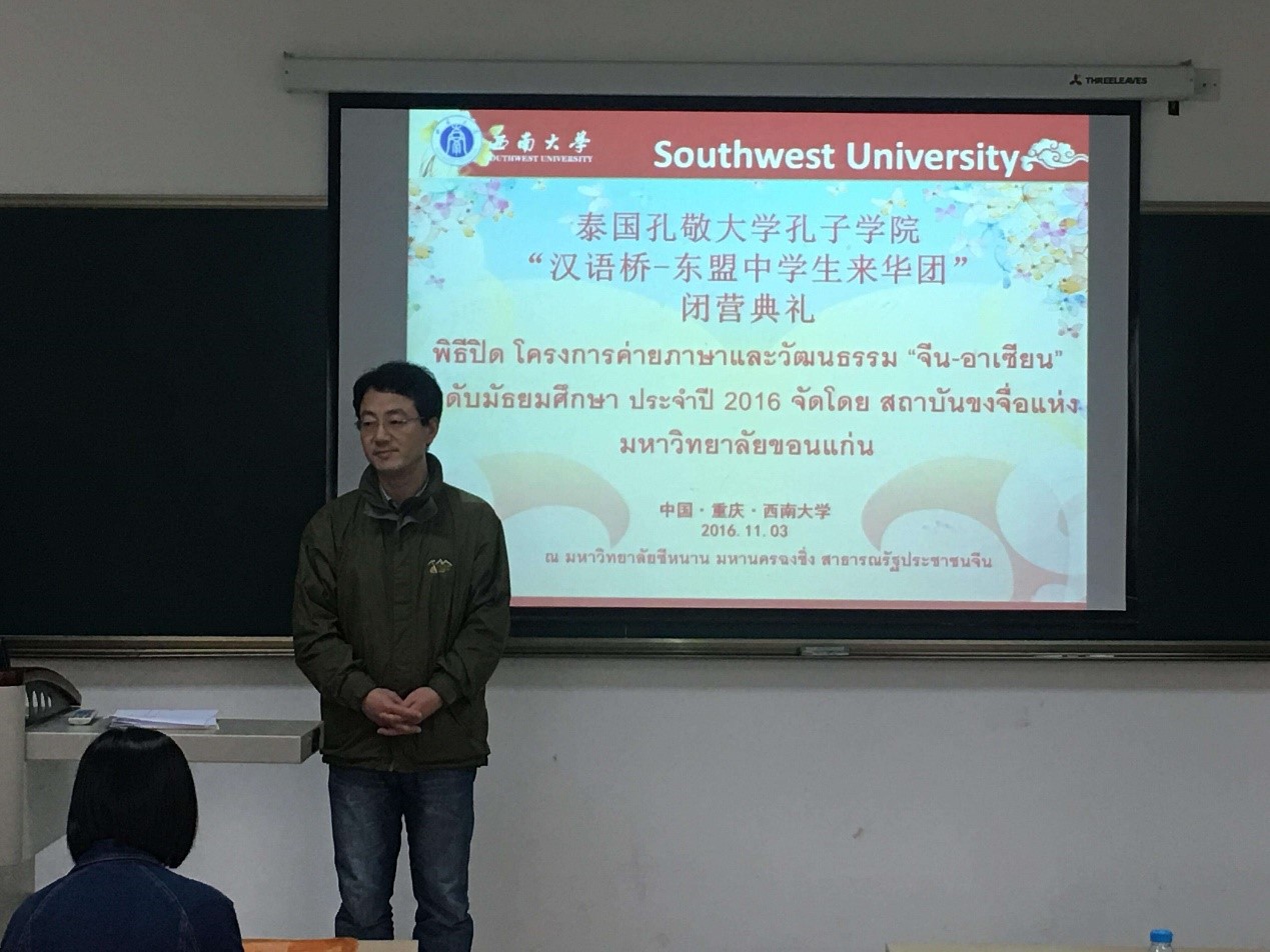 11月3日下午2:30,泰国孔敬大学孔子学院中国-东盟中学生汉语秋季营总结会在伟的国际1946bv紫云楼312室举行,标志着该营圆满闭营。副院长李航,招生办公室主任代远鸿,孔敬大学孔子学院教师代表丁了了,以及19名来自泰东北地区的中学生参加了此次总结会。