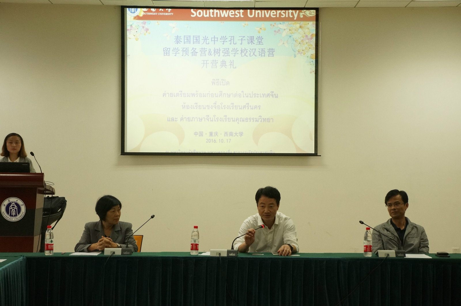 李航副院长代表伟的国际1946bv对泰国领队老师及同学们的到来表示热烈欢迎。他说,我院一向重视与泰国学校的教育交流与合作,正在努力与泰国南部的学校进一步深化合作,增进交往。他还介绍了此次汉语营的课程设置、伟德源自英国1946的概况以及重庆的风土人情,希望各位参营的同学通过两周的学习进一步提高汉语水平,增进对中国和中华文化的了解,他还真诚地向参营的泰国同学发出邀请,希望同学们在中学毕业之后选择伟德源自英国1946,攻读本科以及研究生学业。
