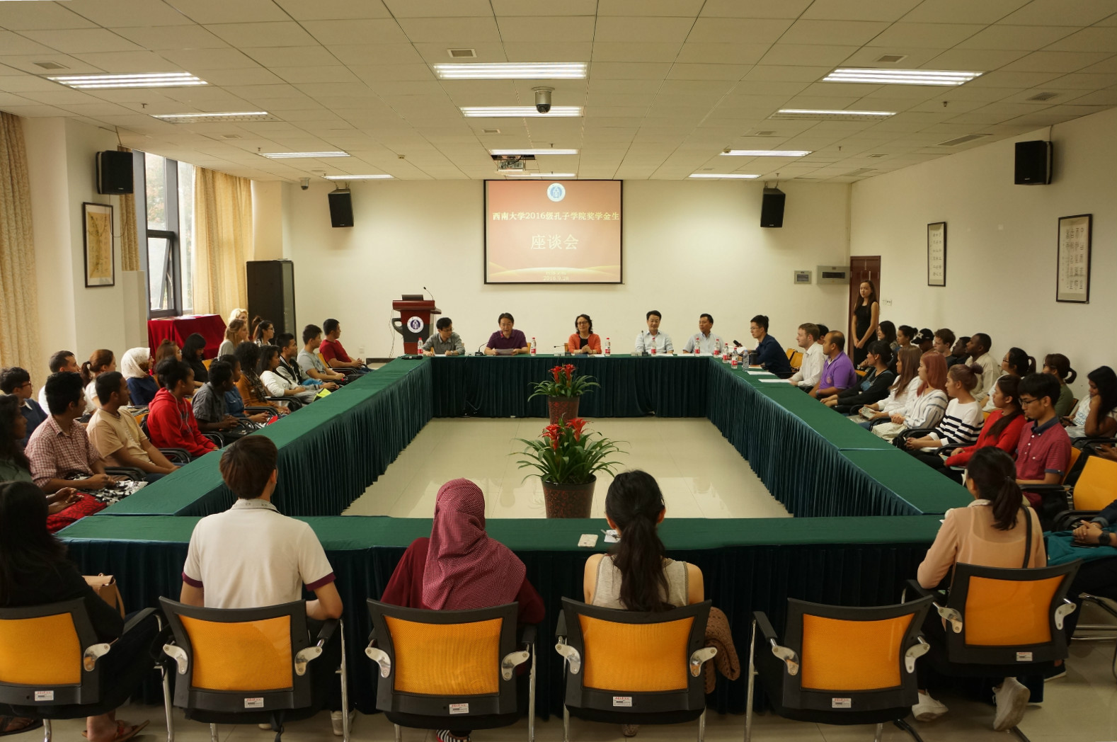 9月28日下午4:30,伟德源自英国19462016级孔子学院奖学金生座谈会在伟的国际1946bv317会议室举行。伟的国际1946bv王静院长、刘猛书记、李航副院长,教师代表以及56名2016级孔子学院奖学金生参加座谈会。座谈会由刘燕妮主持。