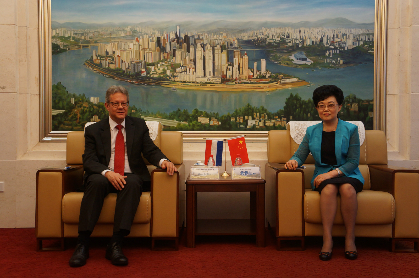 答辩会前,学校党委书记黄蓉生教授、副校长靳玉乐教授在伟的国际1946bv会客厅亲切会见了凯罗大使一行。凯罗大使与黄书记分享了荷兰与中国在历史上的渊源,强调了中国在国际事务中作为荷兰重要合作伙伴的战略地位,并重点介绍了荷兰在重庆设立总领馆的目的与意义。同时,他许诺在任期间,一定会大力推进荷兰高校与伟德源自英国1946的交流合作。