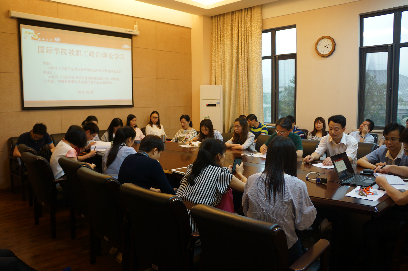 2016年6月2日下午4:00伟的国际1946bv在紫云楼310会议室开展政治理论学习。在伟的国际1946bv党总支书记刘猛的主持下,伟的国际1946bv全体教职工集体学习了《习近平总书记在哲学社会科学工作座谈会上的讲话》、《习近平总书记在全国科技创新大会、两院院士大会、中国科学第九次全国代表大会上的讲话》。大家纷纷结合自身情况对于作为科研工作者如何在自己的岗位上为学校、国家做贡献进行了思考。