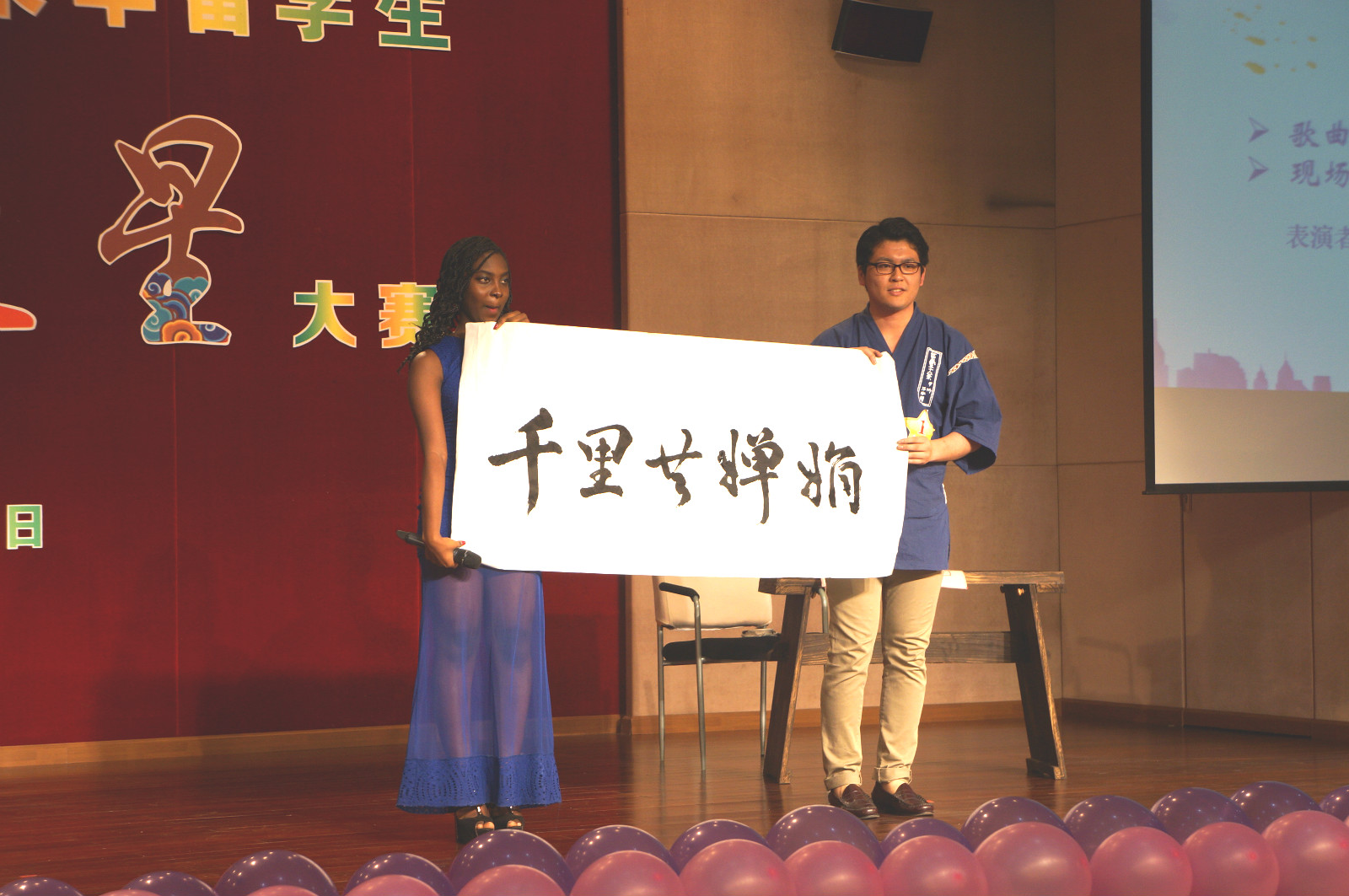 选手们的才艺展示更是让决赛现场高潮迭起。11位选手你方唱罢我登场,将紧张的比赛迅速切换成个人魅力秀时间。茶艺、现场书法、中国歌曲、武术、双节棍、孔雀舞等表演动静结合,刚柔并济,充分体现出留学生们的多才多艺、文武双全。各组别比赛的间歇,串场节目同样精彩,特别是由王静院长和刘猛书记亲自领衔的朗诵节目《伟德源自英国1946赋》,夺得了最热烈的掌声。
