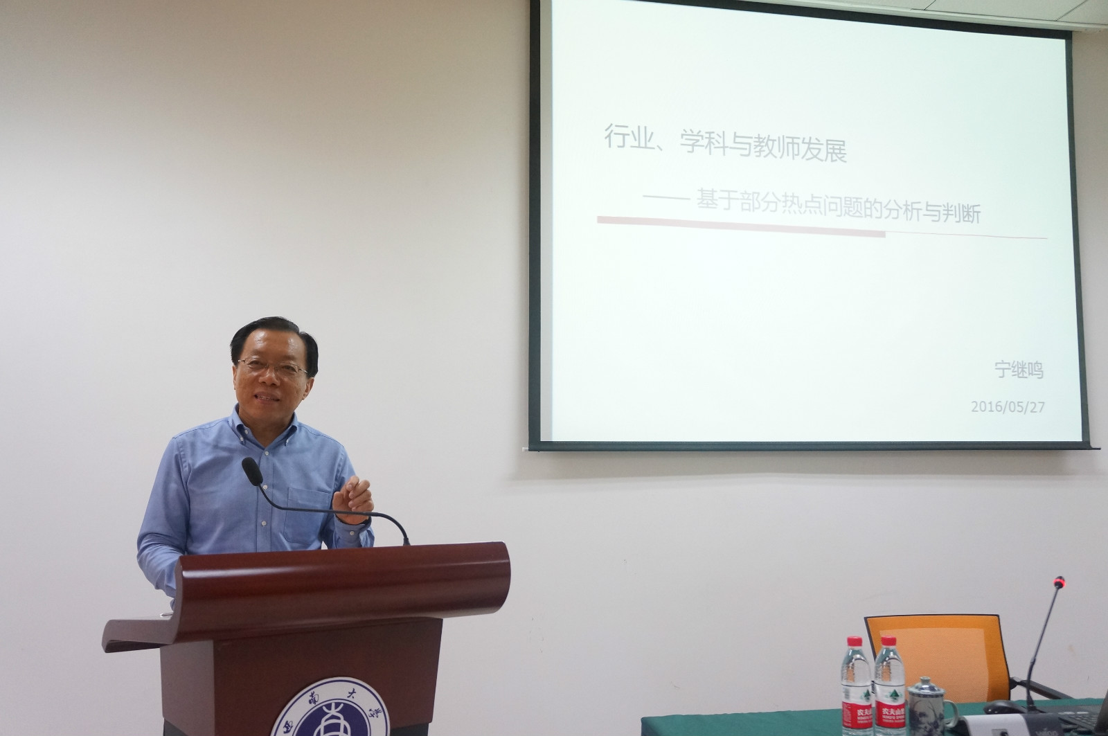 2016年5月27日下午3点,山东大学国际教育学院院长宁继鸣教授应邀在我校伟的国际1946bv317教室举办了一场学术讲座,讲座的题目是“行业、学科与教师发展—基于部分热点问题的分析与判断”。伟的国际1946bv领导、教师以及2014级和2015级汉语国际教育硕士班的中外学生们聆听了此次讲座。