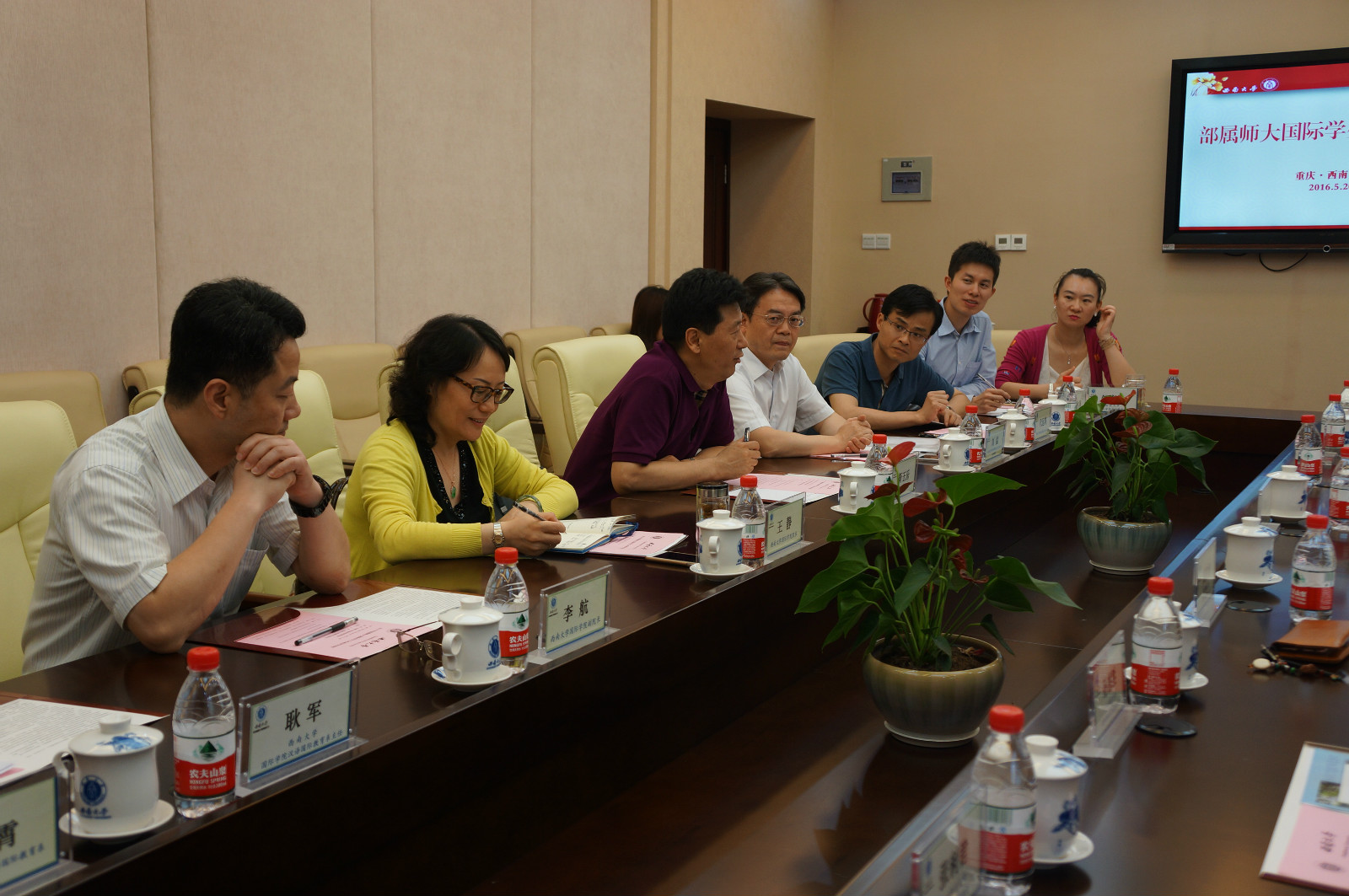 2016年5月20日下午,部属师大国际学生工作座谈会在我校伟的国际1946bv签约室举行。中国高教学会外国留学生教育管理分会副会长兼秘书长贺向民,华东师范大学国际教育中心主任黄美旭,陕西师范大学国际汉学院院长张建成,北京师范大学国际合作与交流处副处长艾忻,东北师范大学国际合作与交流处副处长孙德胜,华中师范大学国际文化交流学院副院长周波,伟德源自英国1946副校长靳玉乐,伟的国际1946bv院长王静、党总支书记刘猛、副院长李航参加了座谈会,会议由伟的国际1946bv院长王静主持。