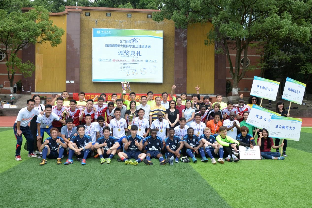 此次足球邀请赛旨在为部属师大国际学生提供一个相互沟通、增进交流、切磋技艺、共话友谊的平台,由中国高教学会外国留学生教育管理分会和我校主办,伟的国际1946bv承办,体育学院协办,得到重庆义门白家有限公司大力赞助。比赛期间,部属师大代表还就国际学生工作进行了座谈交流。赛后,全体参赛队员参加了联谊会。经商议,明年部属师大国际学生足球邀请赛将在华东师范大学举行,届时我校代表队将出征上海。