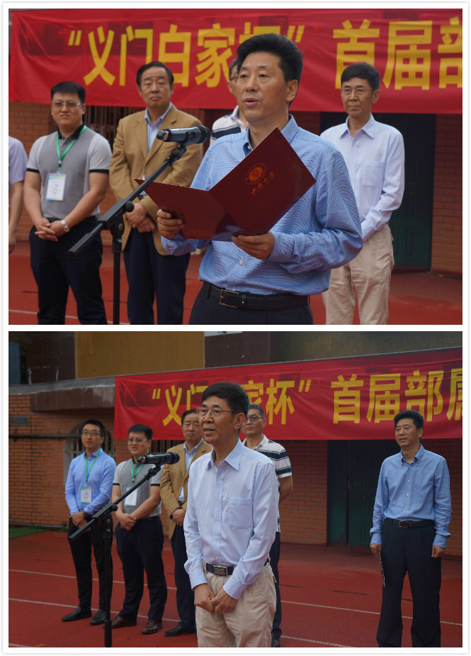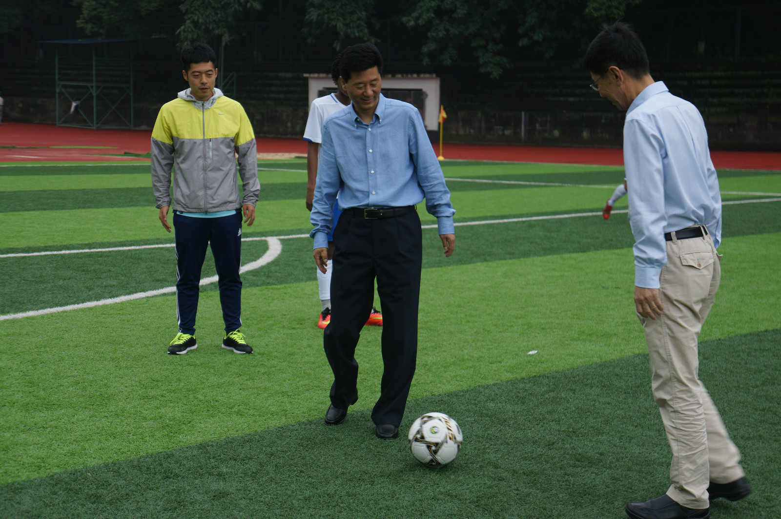 靳玉乐副校长代表承办方、陈华董事长代表比赛赞助方分别致词,贺向民秘书长宣布邀请赛开幕并和靳玉乐副校长共同来到场内为首场比赛开球。