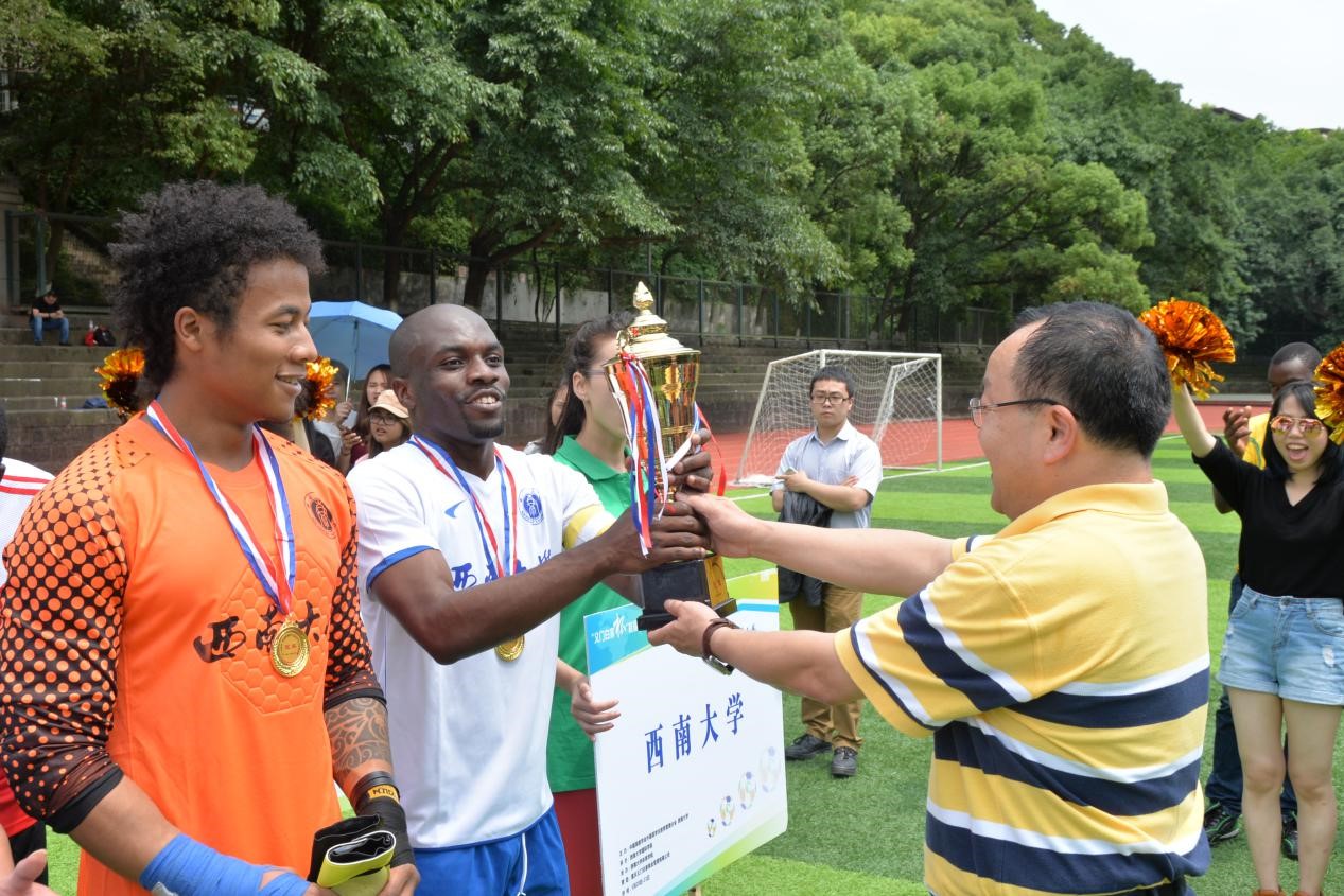 5月21日下午,为期两天的“义门白家杯”部属师大国际学生足球邀请赛在我校落幕,我校国际学生足球队摘得桂冠。