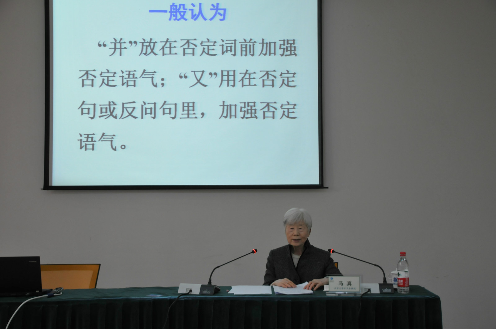 在老师和同学们热烈的掌声中,马真先生开始了题为“要重视词语和句法格式的用法研究”的讲座,她为我们细致讲解了语气副词“并”、“又”,副词“反而”、“按说”,状态词“好端端的”,以及“把”字句、“被”字句等使用的语义背景。在分析过程中,马先生以留学生出现的偏误句为例,指出不以汉语为母语的留学生在汉语运用中往往只重视辞书对词义的解释,却忽略了其使用的语义背景。讲座过程中,马先生寓教于乐,通过对外汉语教学的实例向我们展示了语义背景对我们选词造句的影响,充分显示了马真先生在现代汉语虚词研究方面深厚的功底;在研究方法上,马先生更是另辟蹊径,注重创新。结合伟的国际1946bv的情况,马先生强调在留学生教学中,一定要重视词语和句法格式的语义背景,也希望这个问题能够引起对外汉语教学届或汉语国际教育界以及辞书编撰者的重视。最后马真先生总结道:“要说清词语和句法格式使用的语义背景十分不易,但是面对日益发展的汉语国际教育,我们必须予以重视。”