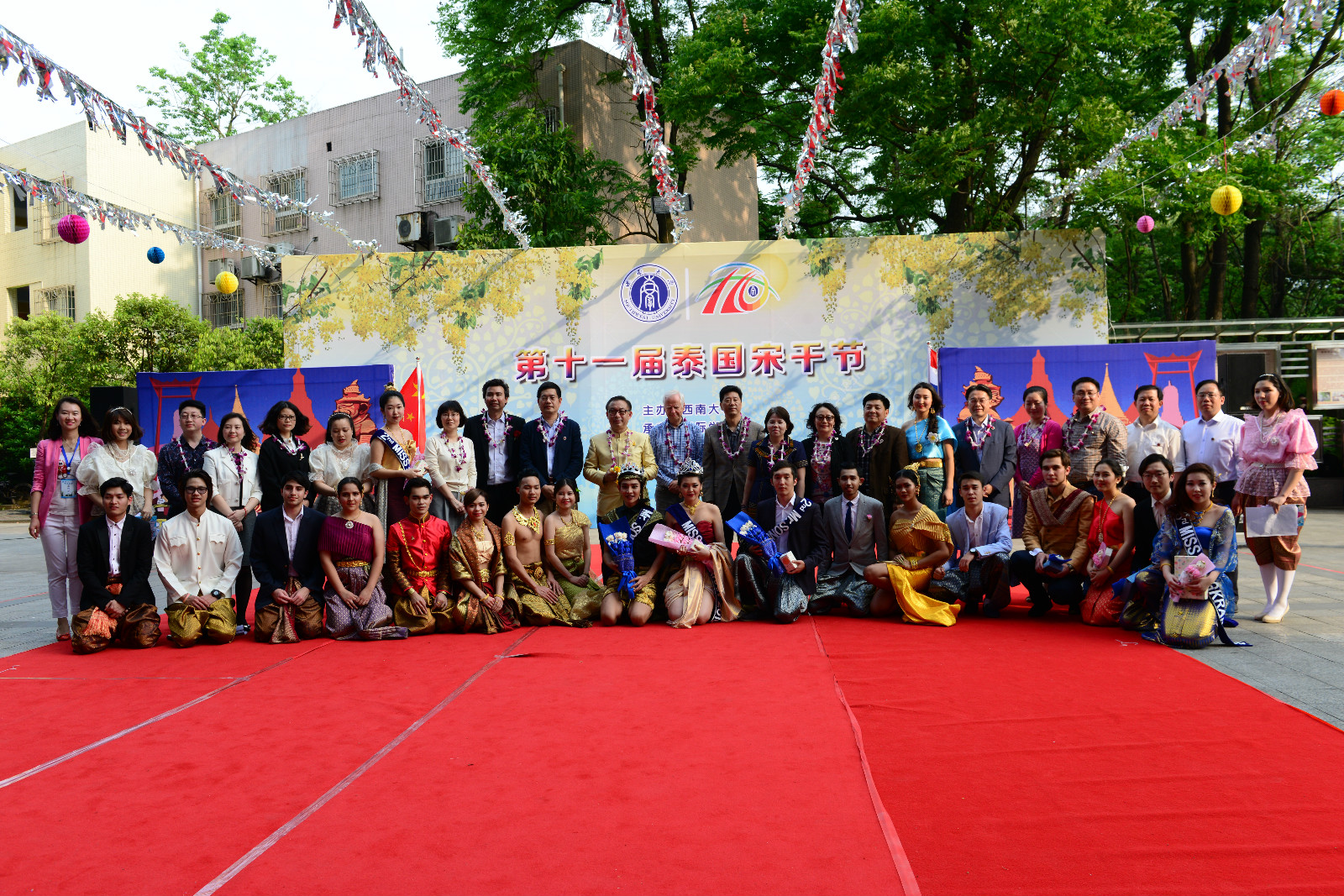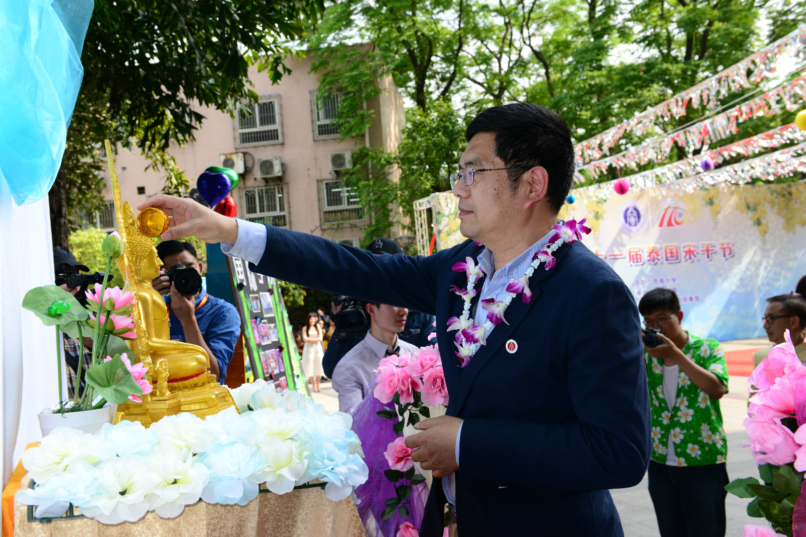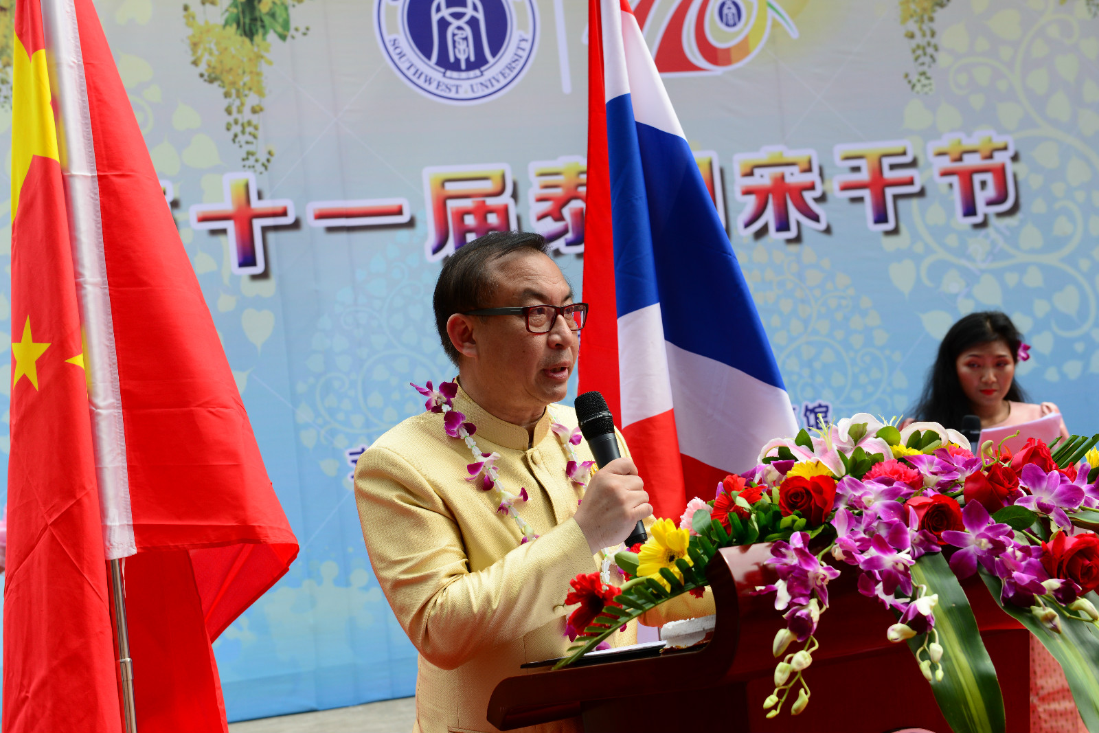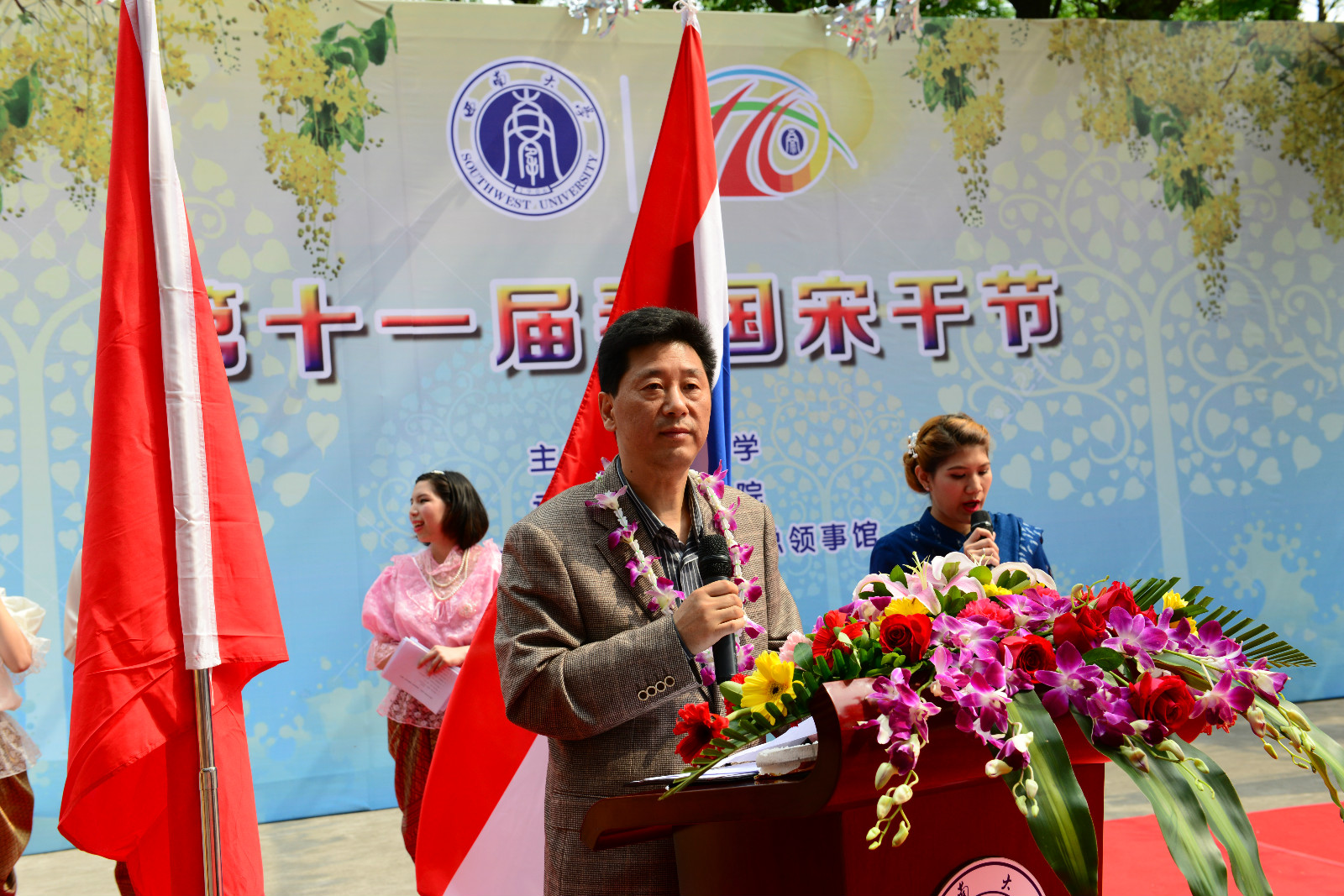 副校长靳玉乐首先致辞,代表学校向出席活动的各位领导和来宾表示欢迎。他说,学校举办宋干节,不仅是为了给来自五湖四海的同学们呈现一个泰式风情新年,更是为了给所有在校的泰国同学留下一份美好的回忆,传达学校对他们的无限关爱和祝福,希望泰国同学在泰历新年努力奋斗,茁壮成长,以实际行动迎接学校合并组建10周年暨办学110周年的到来。