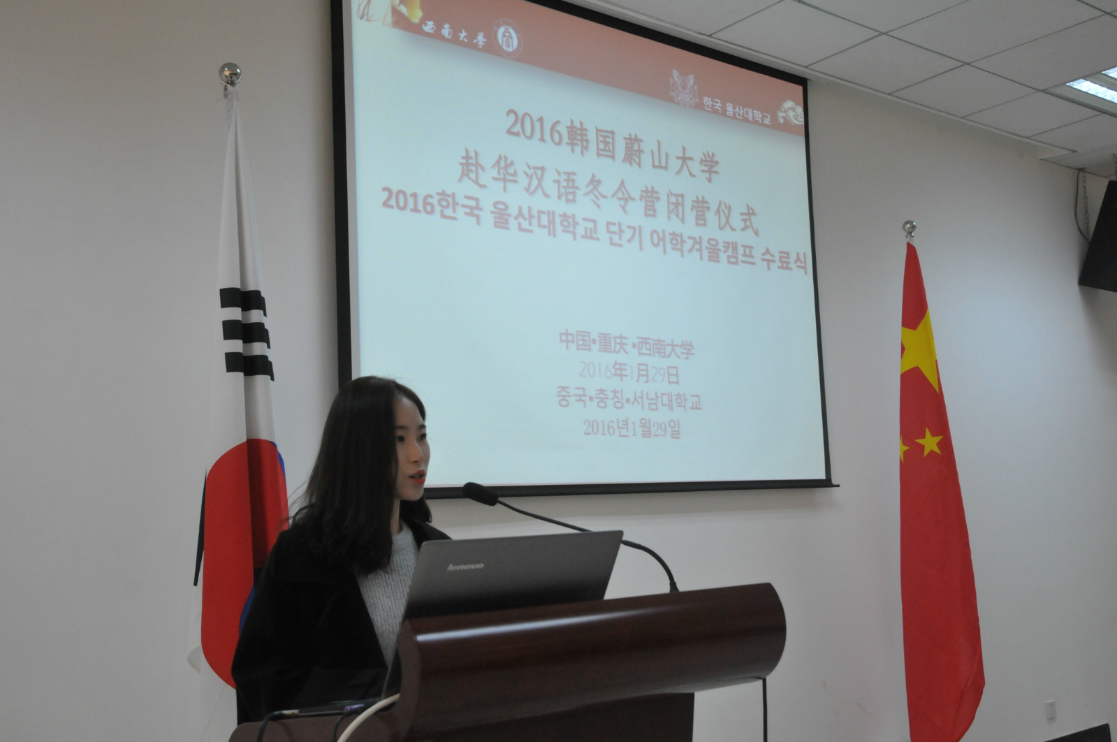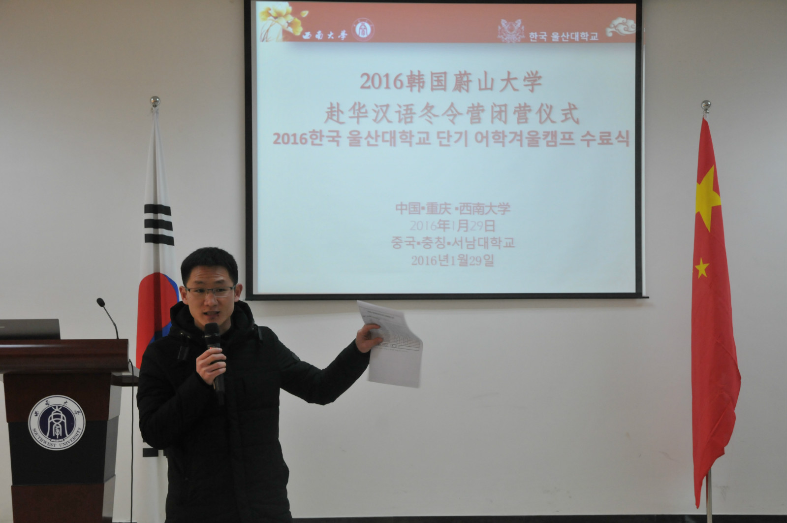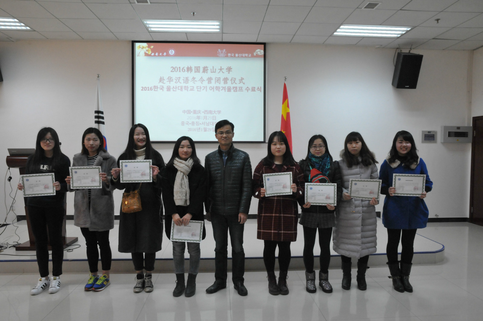 2016年1月29日,2016韩国蔚山大学来华汉语冬令营闭营仪式在紫云楼317室隆重举行,伟的国际1946bv党总支书记兼副院长刘猛、招生办公室主任代远鸿、教师代表舒敬斌,以及国际志愿者代表和蔚山大学43名营员参加仪式。闭营仪式由王鹊主持。
