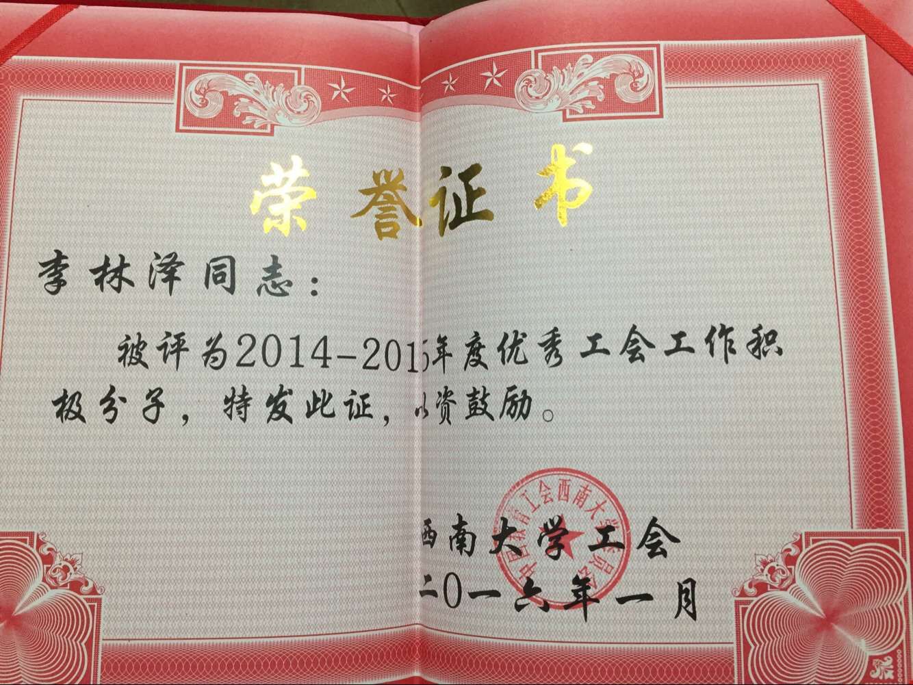 我院李林泽老师荣获“2014-2015年度优秀工会工作积极分子”