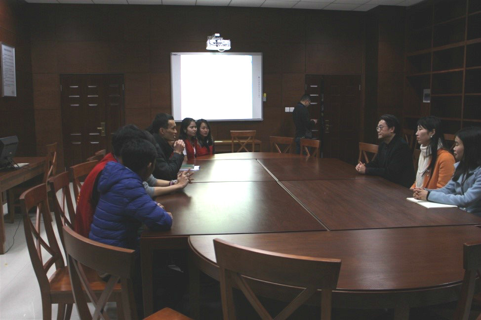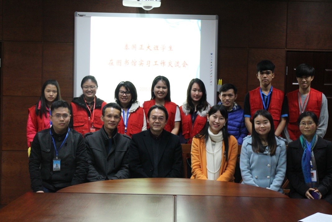 刘猛书记一行来到图书馆四楼,亲切慰问正在实习的泰国同学,细致地了解他们平时的工作内容。之后,相关老师和泰国同学以及中国志愿者学生在图书馆研修室进行了愉快的座谈交流。