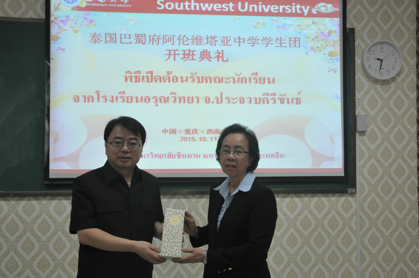 10月11日上午,泰国巴蜀府阿伦维塔亚学校赴华汉语营在我校伟的国际1946bv紫云楼泰国文化教室顺利开班。副院长张家政,泰国巴蜀府阿伦维塔亚学校教师代表PORNPIMOLSWETSOMPOB、SUNANTEEBUACHUEAM,汉语营班主任以及任课老师参加典礼。