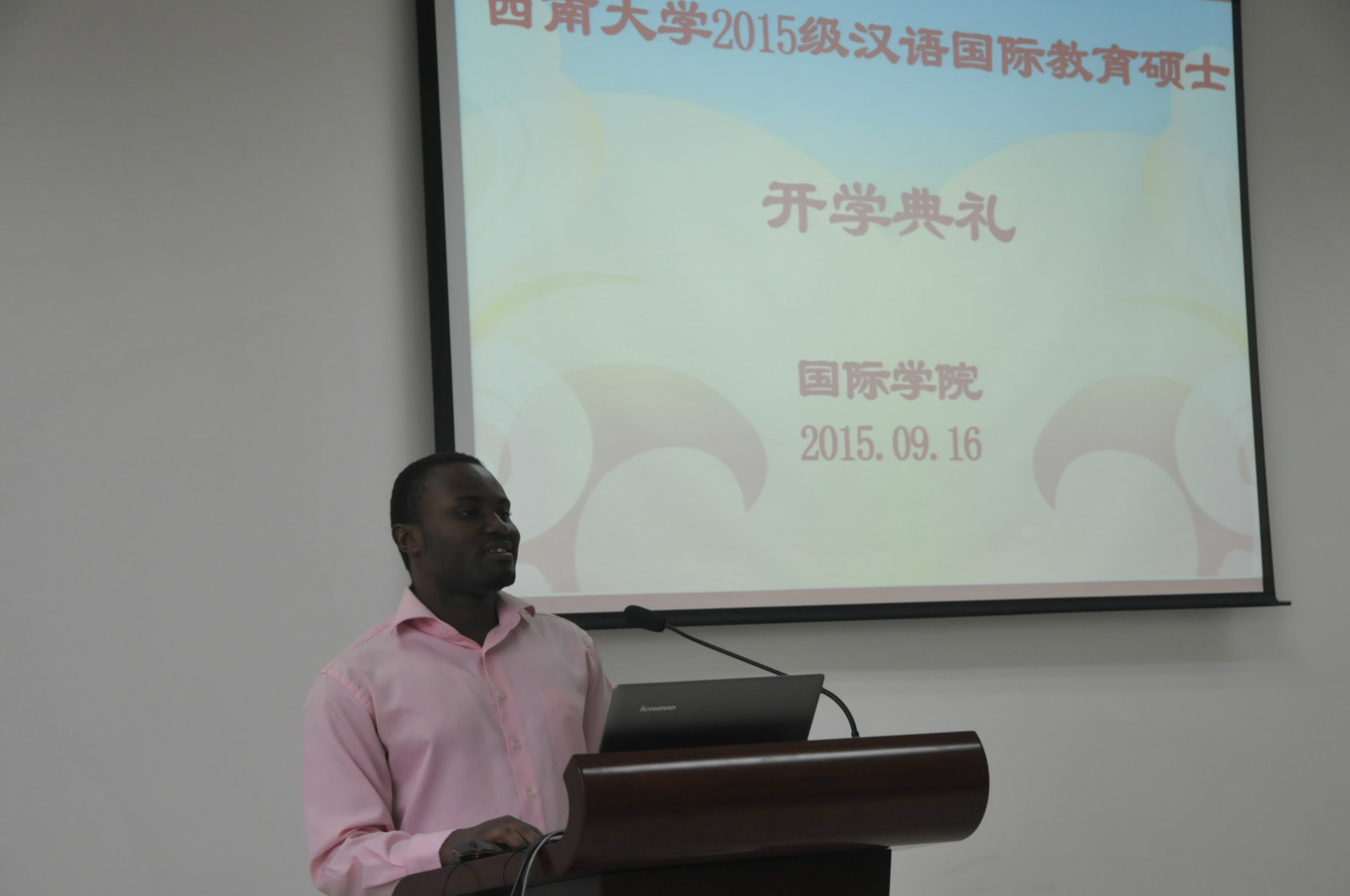 2014级汉语国际教育硕士狄小倩作为老生代表发言。她向大家介绍了汉语国际教育专业的学习和实习情况,阐释了汉语国际教育的专业使命,并表示会帮助各位新同学尽快融入新生活。来自喀麦隆的法如斯和中国学生万明岩分别代表中外汉硕新生发言。他们都表达了对崭新学习生活的憧憬,并表示在今后的学习生活中要抓住当今文化交流的契机,让语言和文化充当使者,融通古今智慧,传播中国文化,促进世界多元文化发展。