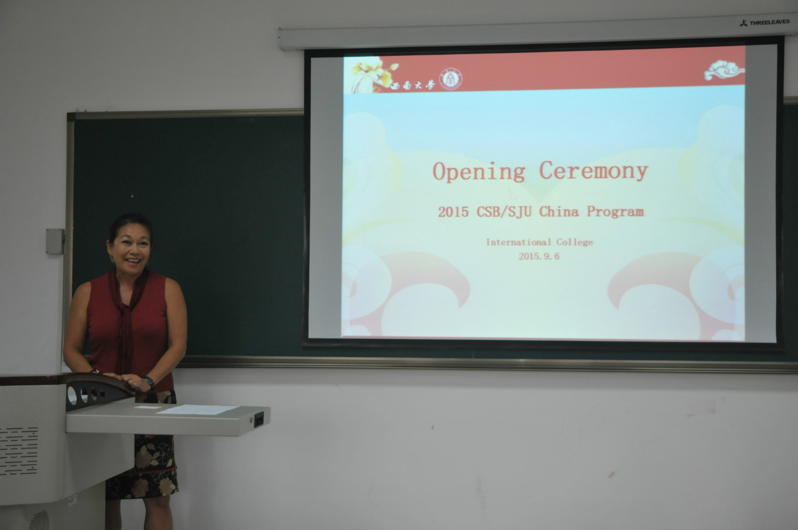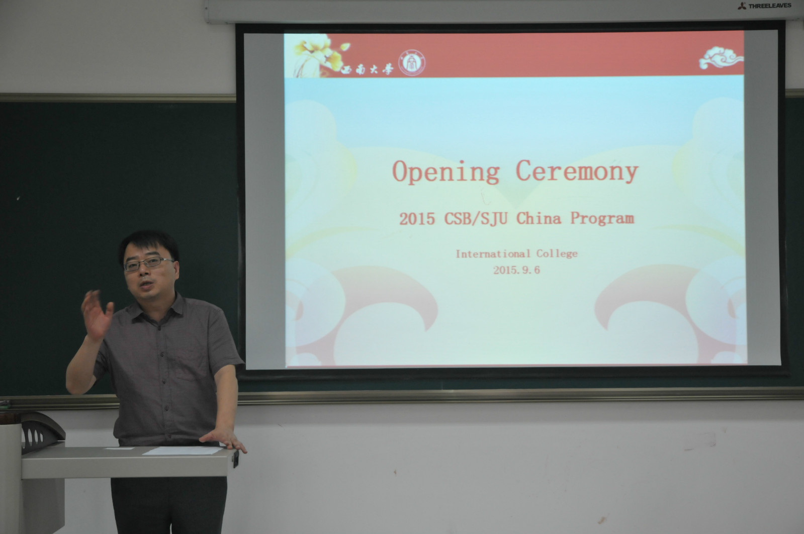 2015年9月6日下午4时,美国圣约翰大学/圣本尼迪克学院项目班开班典礼在伟的国际1946bv紫云楼312室举行。伟的国际1946bv副院长张家政、美国圣约翰大学领队教师Vilma Walter、项目班18名学员以及来自我校外国语学院的语伴参加典礼。
