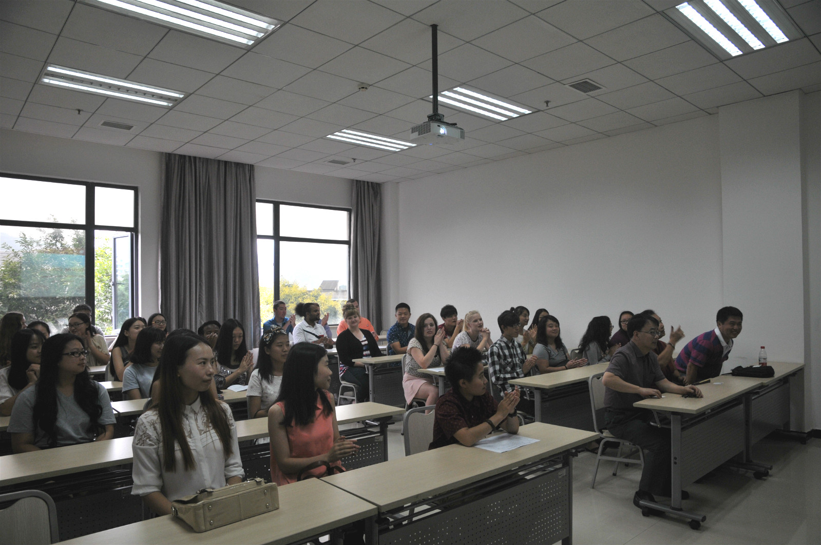 美国学生代表和来自外国语学院的语伴代表相继发言后,中美双方教师互赠礼品。开班典礼圆满结束。