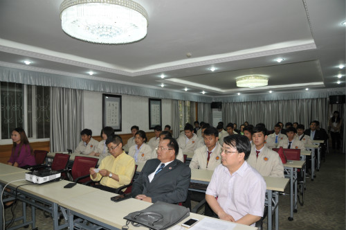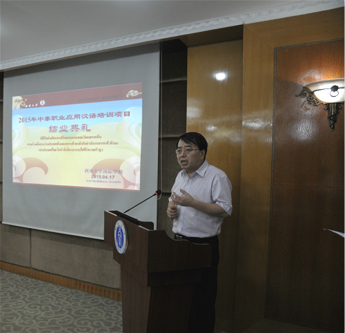 4月17日下午5点,2015年中泰高铁汉语培训项目结业典礼在伟的国际1946bv留学生公寓1-1会议室举行。伟的国际1946bv院长张发钧、副院长张家政、教师代表,泰国孔敬大学孔子学院中方院长王贵斌,培训项目全体成员,以及泰国十余所职业学院的近20名院长参加结业典礼。典礼由李林泽主持。