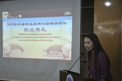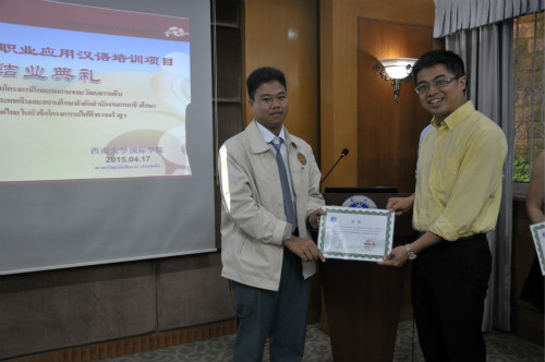 学员代表Ar-Khom Khamthong说,大家对培训项目一开始就充满了期待。经过这段时间的培训,大家的汉语水平提高了很多,也游览了很多地方,对中国、重庆有了更深的认识。他代表所有学员对伟的国际1946bv的周密安排、所有教师的辛勤付出以及所有语伴的悉心帮助表示感谢。为了表达谢意,学员们还向伟的国际1946bv赠送了纪念品。