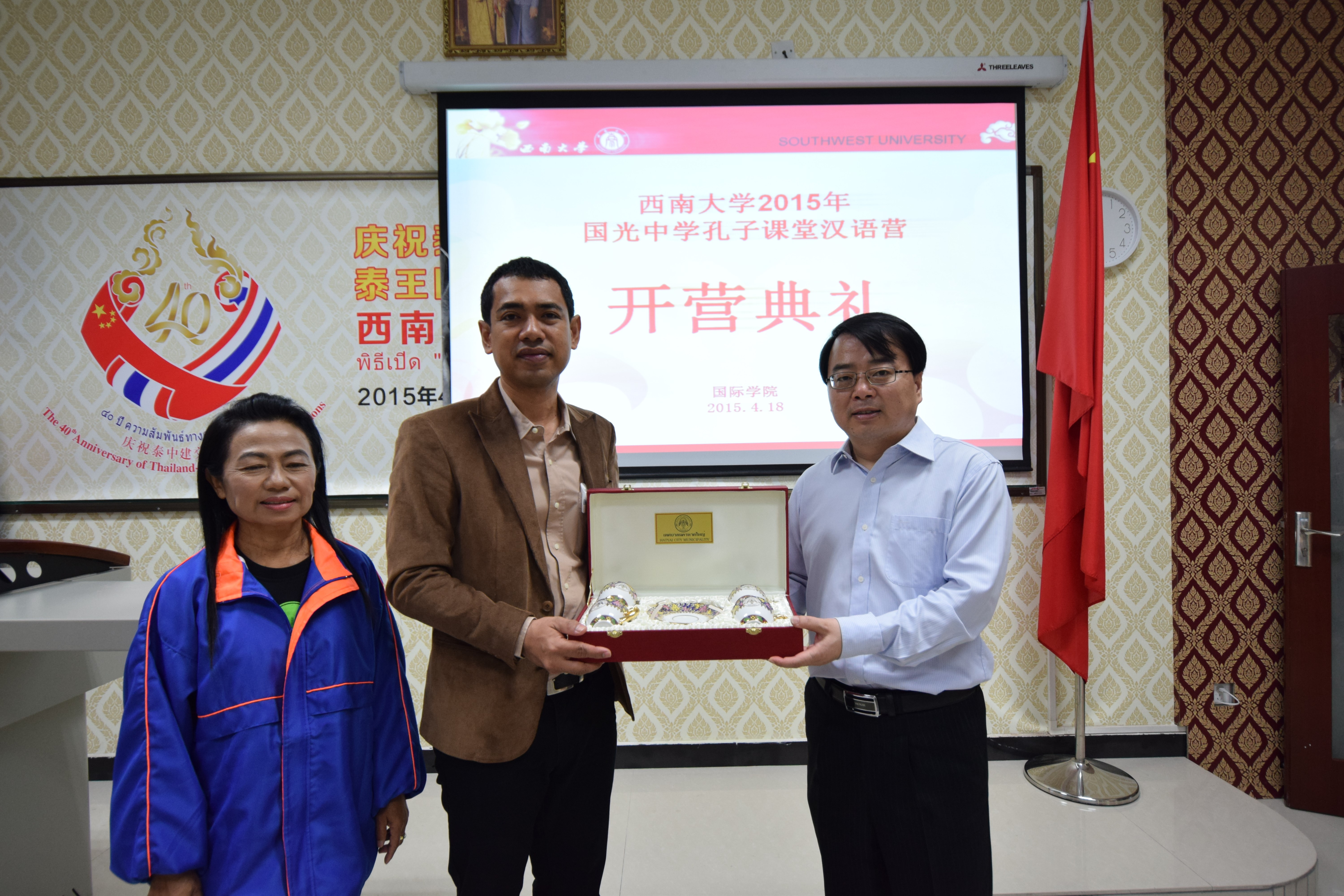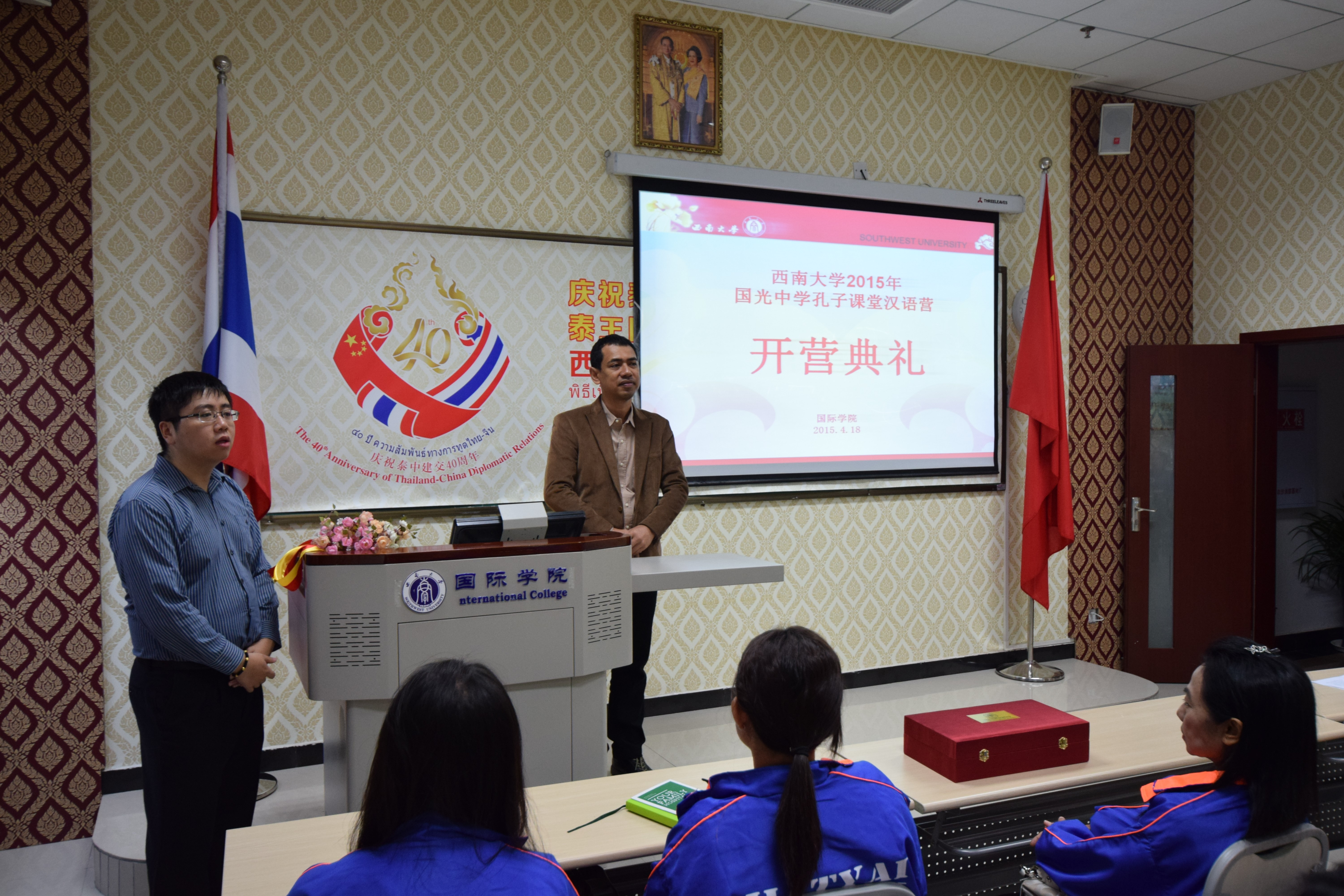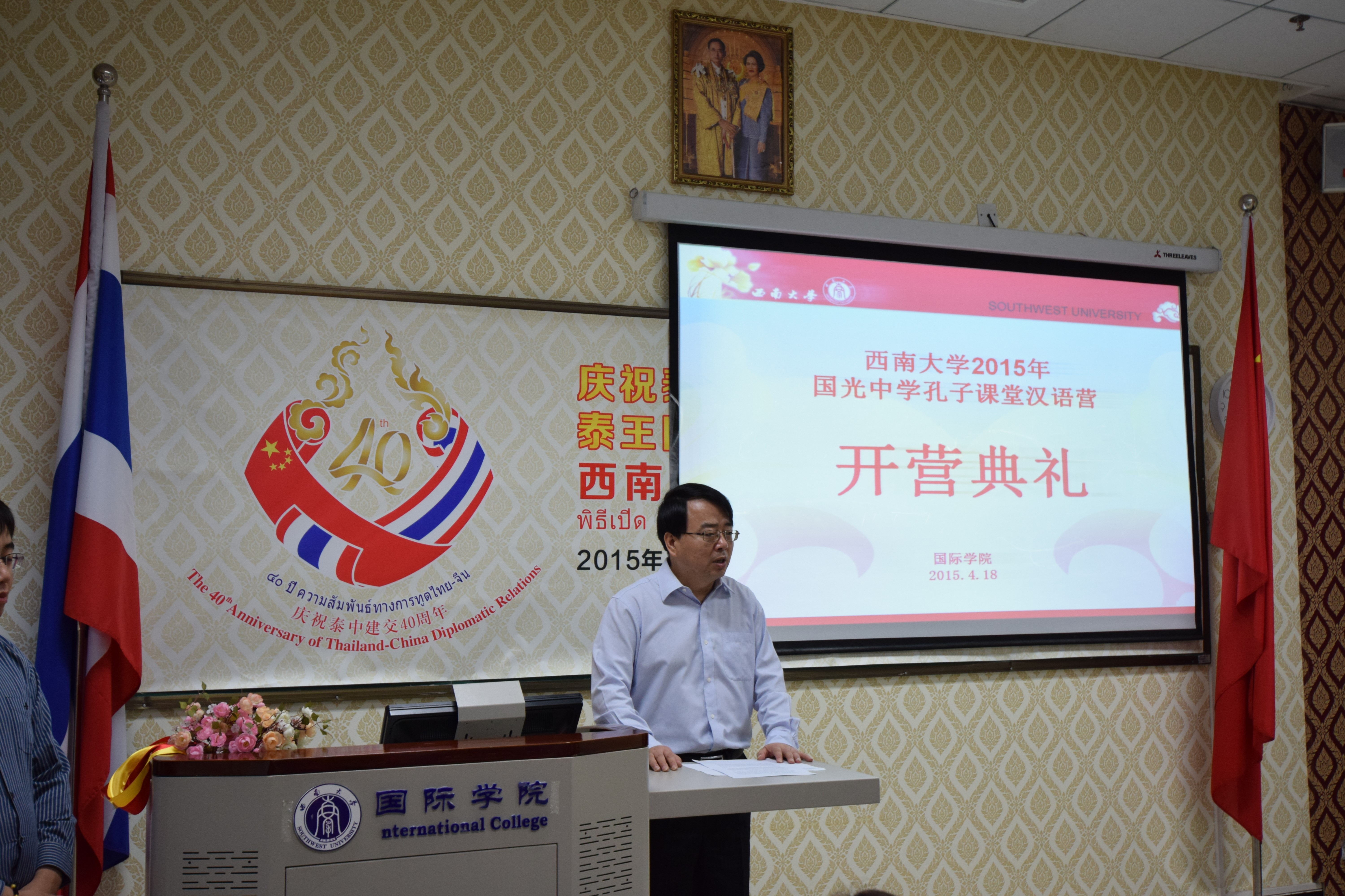 4月18日上午九点,伟的国际1946bv在刚刚揭幕的泰国文化教室为泰国国光中学孔子课堂赴华汉语营一行22人举行开营典礼。泰国合艾市副市长PRUEK PATTANO先生和合艾市教育局局长SUTASNAN NIAMRAT女士以及伟的国际1946bv张家政副院长出席。