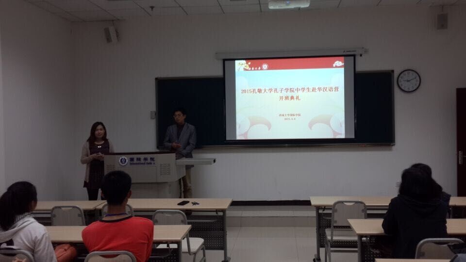 4月6日上午9时,泰国孔敬大学孔子学院中学生赴华汉语营开班典礼在伟的国际1946bv312教室举行。伟的国际1946bv院长张发钧出席了开班典礼。
