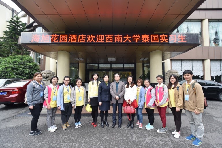 为切实落实2014届泰国正大管理学院"1+1+2"商务汉语项目班的实习工作,4月9日下午,伟的国际1946bv党总支书记兼副院长刘猛、学工办主任陈雨曦、班主任李丹及9名泰国学生一起来到北碚海旭花园酒店实地考察。