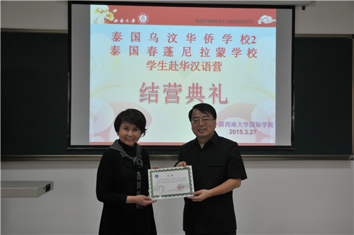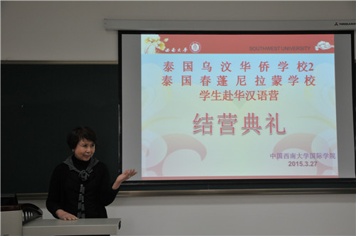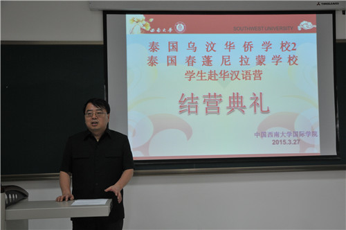 3月27日上午11点,2015年泰国乌汶华侨学校2及泰国春风尼拉蒙学校学生汉语营结营典礼在伟的国际1946bv紫云楼312教室举行。伟的国际1946bv张家政副院长,泰国乌汶华侨学校2校董WILAI TRIROJPORN女士,伟的国际1946bv教师代表李真真、杨凌霄,泰国乌汶华侨学校2及泰国春风尼拉蒙学校的师生,汉语营语伴等共计30余人参加了结营典礼。典礼由李林泽主持。