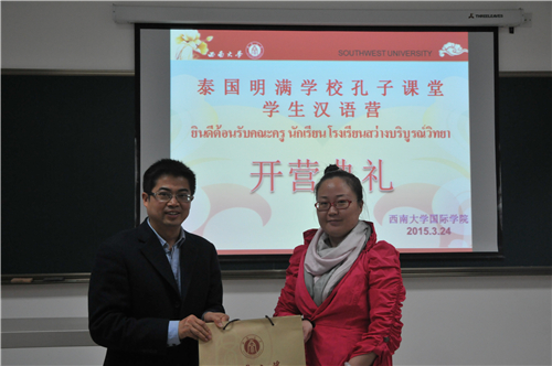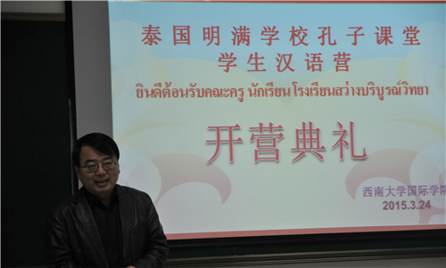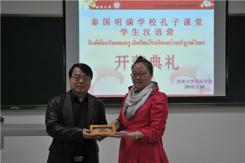 3月24日下午3点,伟的国际1946bv在紫云楼312教室为泰国明满学校孔子课堂汉语营师生一行21人举行了开营仪式。伟的国际1946bv张发钧院长、张家政副院长,教师代表李真真参加了典礼。