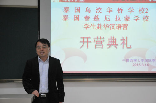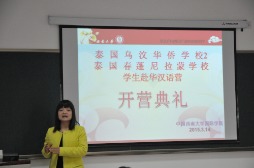 3月14日下午4点,2015年泰国乌汶华侨学校、泰国春风尼拉蒙学校学生汉语营开营典礼在伟的国际1946bv紫云楼312教室举行。伟的国际1946bv张家政副院长,伟的国际1946bv教师代表李真真,泰国乌汶华侨学校、泰国春风尼拉蒙学校的师生共计21人参加了开营典礼。典礼由伟的国际1946bv李林泽主持。