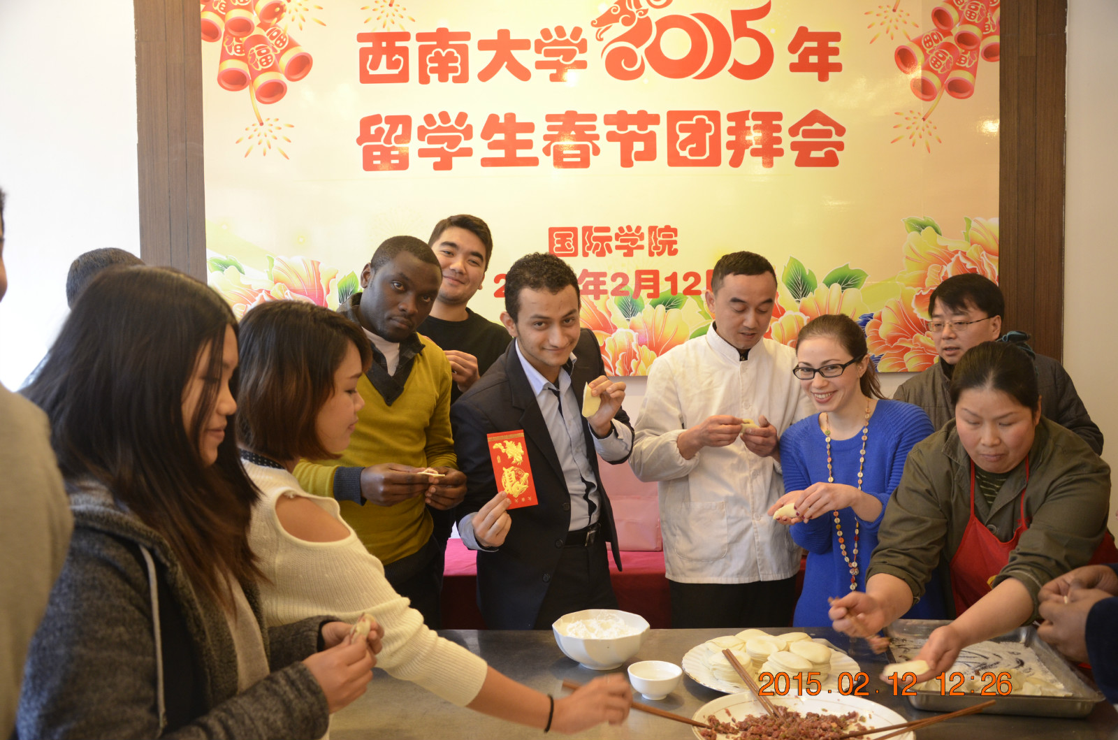 此举也是为了让来自世界各国的留学生了解中国传统文化,度过一个温馨祥和的羊年春节。刘猛书记在会上致辞,向大家介绍中国春节的传统习俗,并回顾2014年来华留学生教育的发展及取得的成绩,祝福大家生活喜乐洋洋,学习如羊吃苦,做人扬眉吐气,在羊年里洋洋得意。张家政副院长希望大家扬起生活的风帆,走向“羊”关大道。留学生会主席、来自坦桑尼亚的阿普杜同学代表留学生发言,感谢学校和伟的国际1946bv能给大家机会在中国学习和体验传统文化,并为大家送上了新年祝福。
