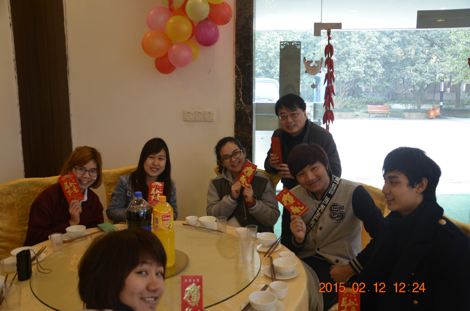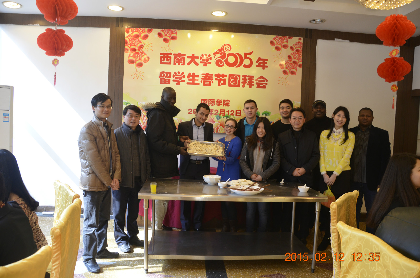 2月12日中午,2015年留学生春节团拜会在外办餐厅如期举行。伟的国际1946bv党总支书记兼副院长刘猛、副院长张家政、招生办主任代远鸿、学工办主任陈雨曦、教师代表以及留校百余留学生欢聚一堂,共度佳节。