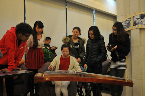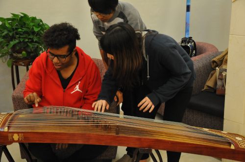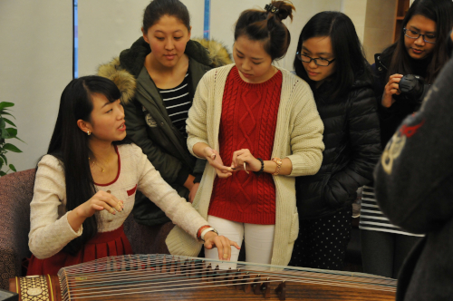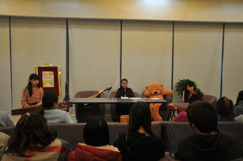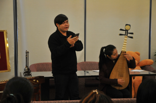 活动以刘老师的一首古典琵琶曲《十面埋伏》拉开序幕,清脆悠扬的琴声,生动伶俐的表演,在活动一开始时就深深地吸引了留学生。一首琵琶曲后,刘老师为大家讲解了与琵琶相关的一些历史文化和音律知识,同学们听得津津有味。在后来的互动交流环节,同学们纷纷来到台前和老师进行琵琶伴奏演唱,以及乐器体验交流。《青花瓷》、《甜蜜蜜》、《康定情歌》、《我心永恒》等一首首风格不同的歌曲在刘老师的琵琶伴奏和同学们的歌声中将活动推向高潮。通过这次活动,在场的留学生都对中国的传统乐器有了一定的了解;在体验环节结束后,也让一些同学对各种乐器产生了浓厚的兴趣,他们希望之后有机会可以通过学习中国传统乐器这个方式来更多的了解中国博大精深的文化。最后,活动在琵琶、古筝、扬琴、竹笛四种乐器的合奏曲《春苗》中,完美谢幕。