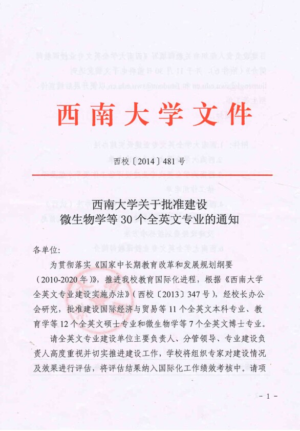 近日,为贯彻落实《国家中长期教育改革和发展规划纲要(2010-2020年)》,推进我校国际化进程,根据《伟德源自英国1946全英文专业建设实施办法》,经校长办公会研究,批准建设微生物学等30个全英文授课专业(见西校【2014】481号)。