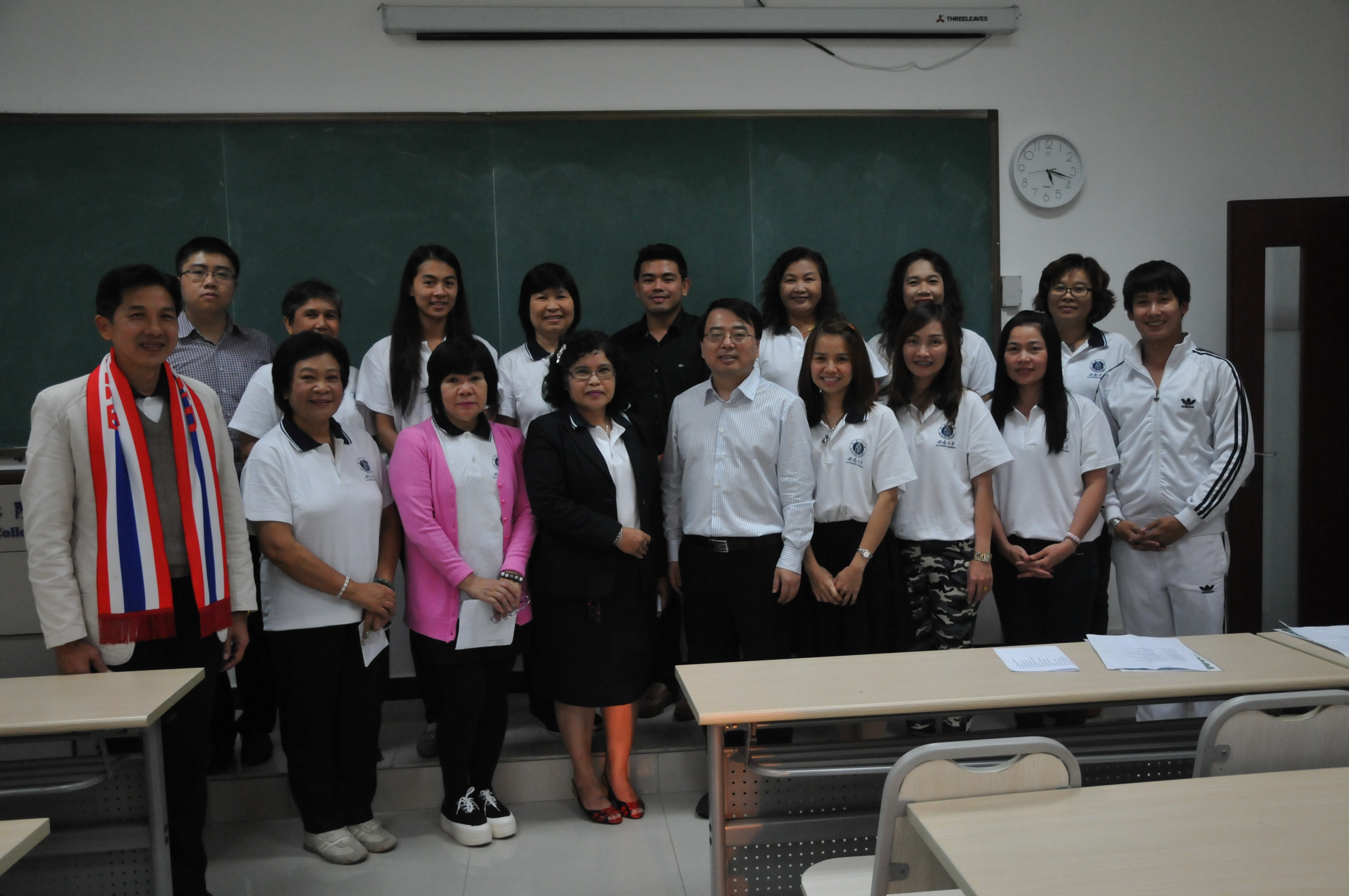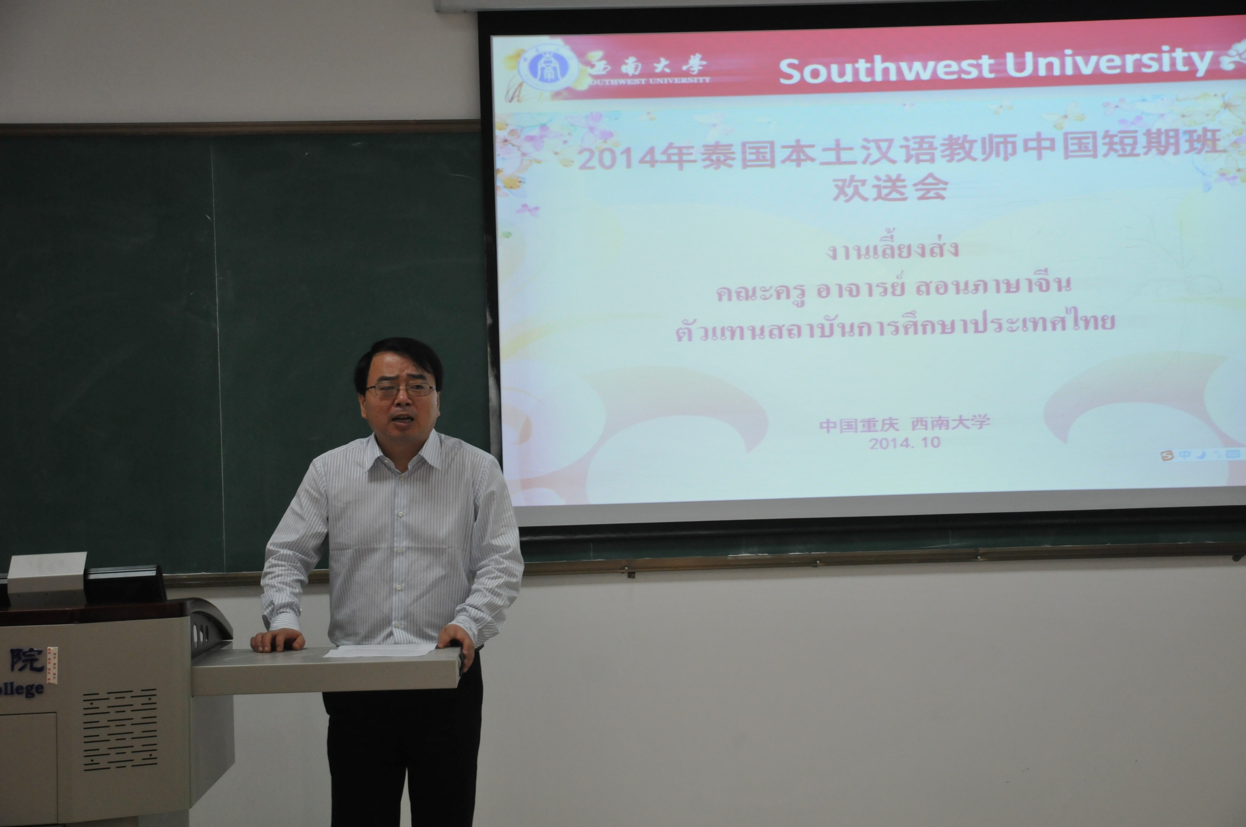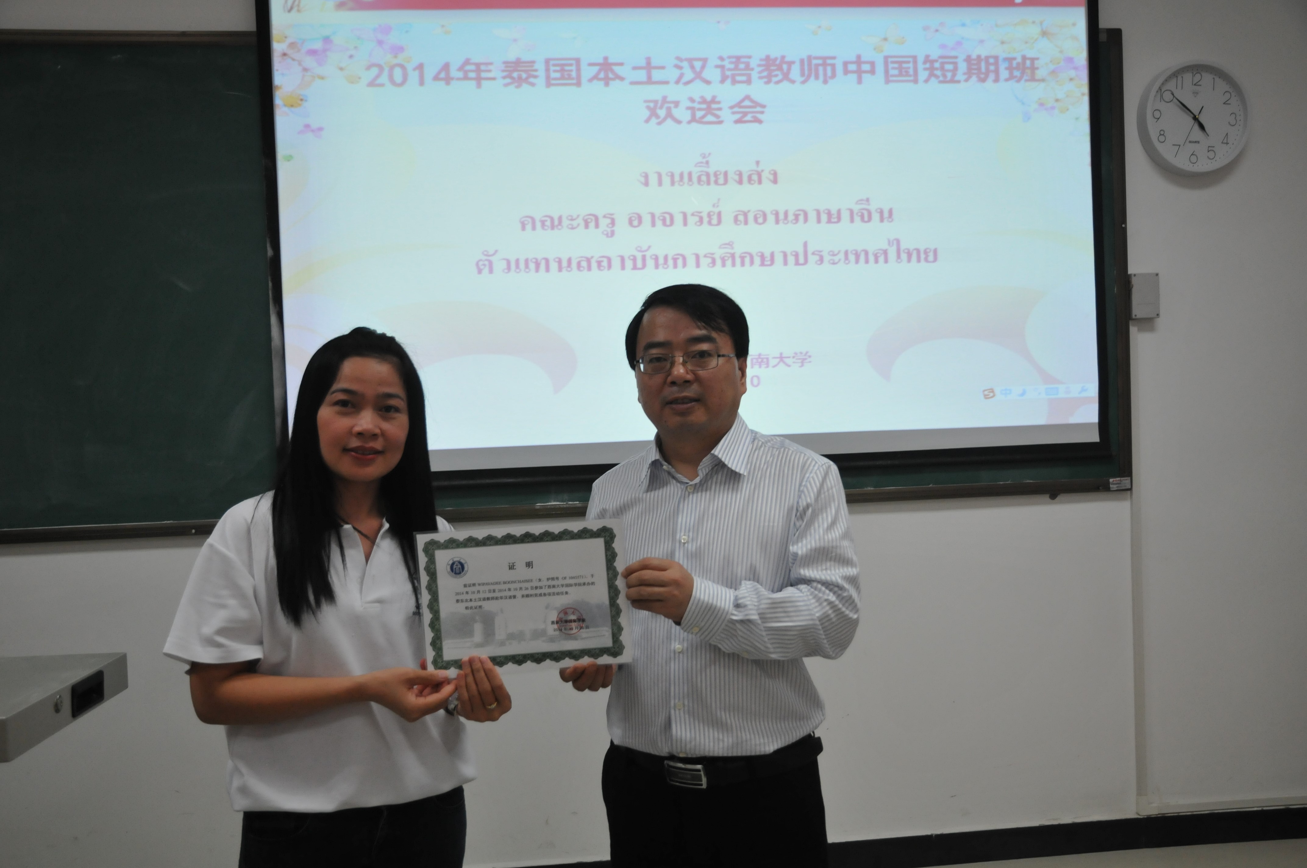 10月25日下午四点半,2014年泰东北本土汉语教师赴华汉语秋令营欢送会在伟的国际1946bv紫云楼210室举行。伟的国际1946bv副院长张家政以及来自泰国的20名本土汉语教师参加了此次欢送会。
