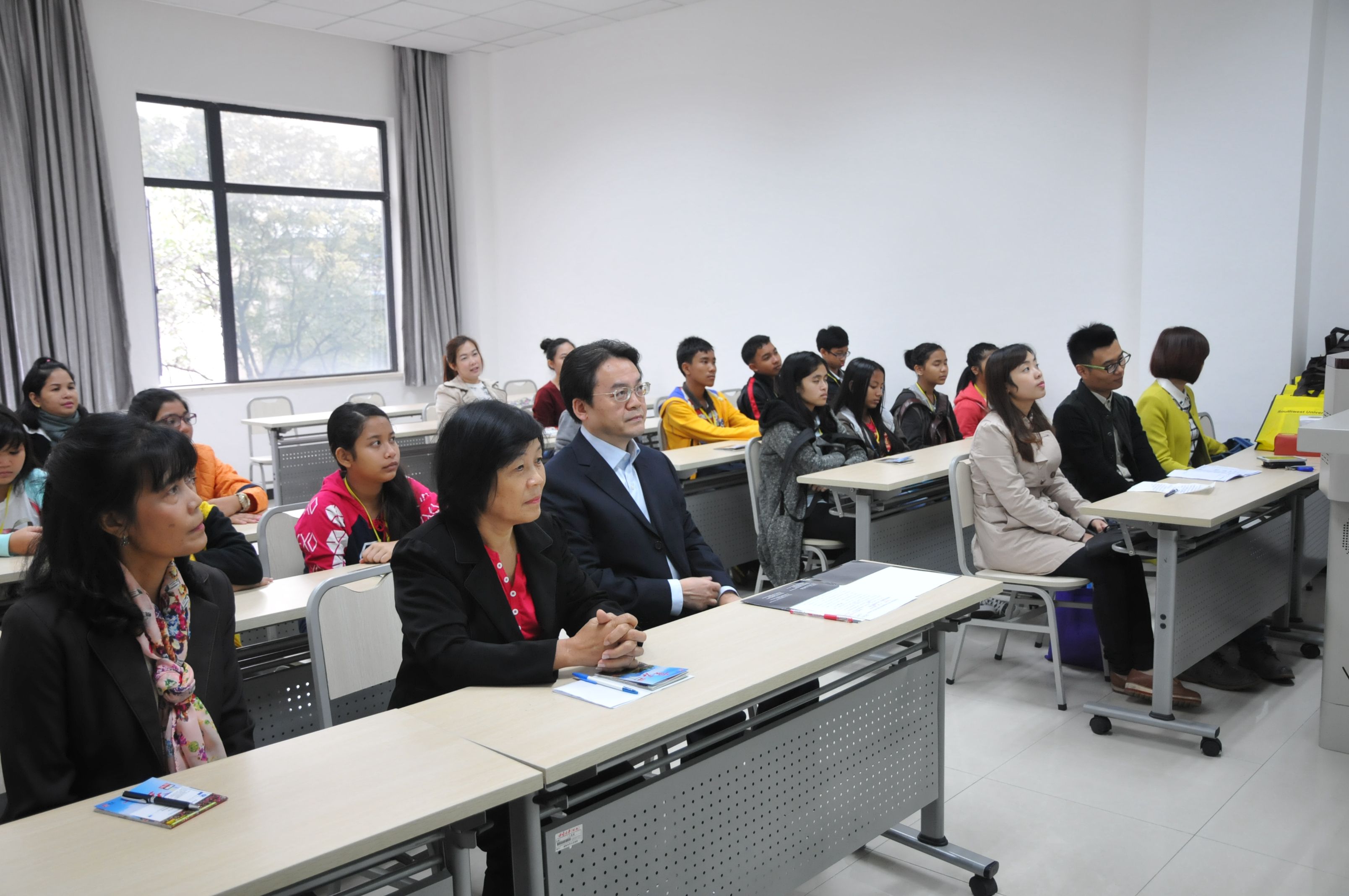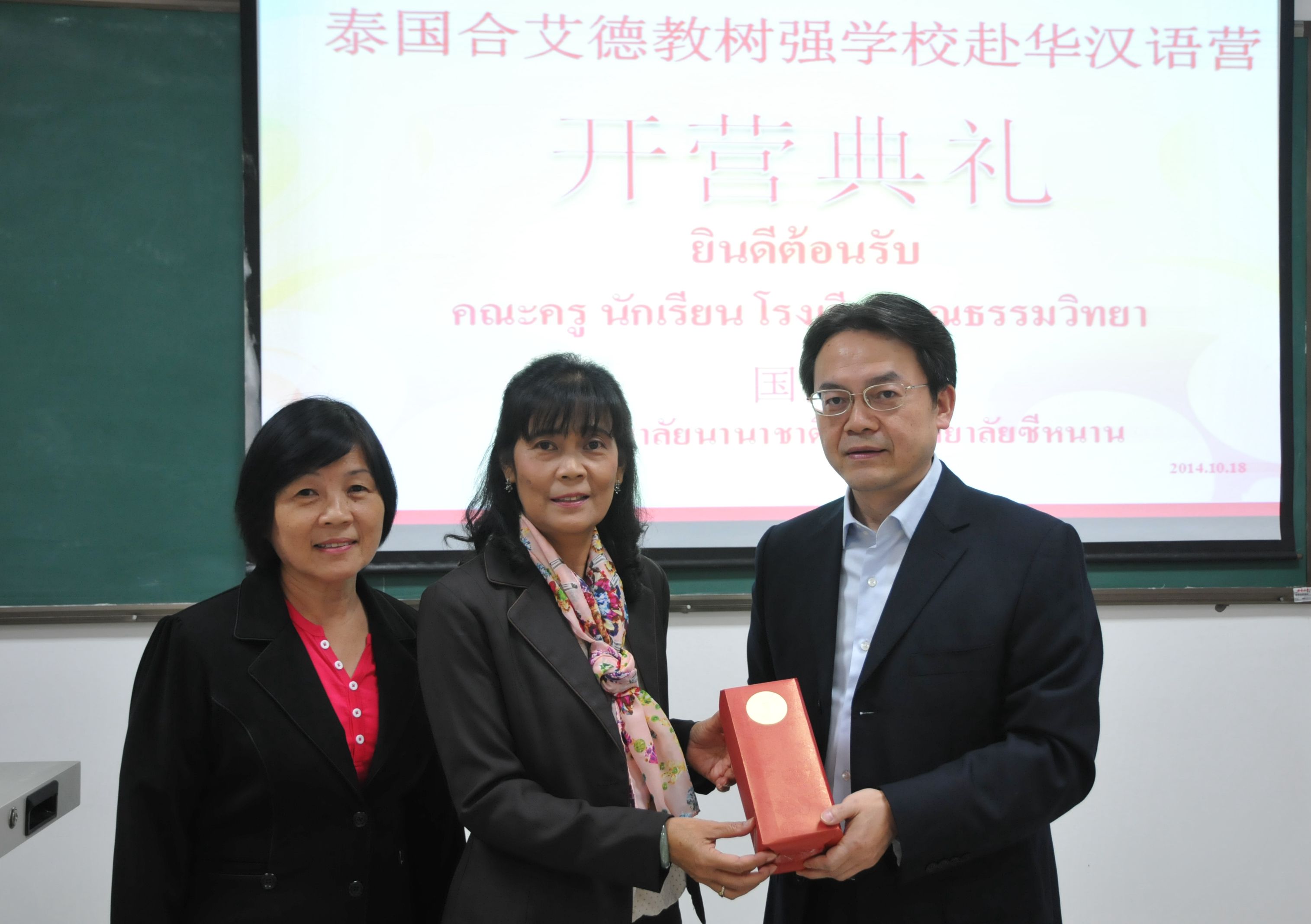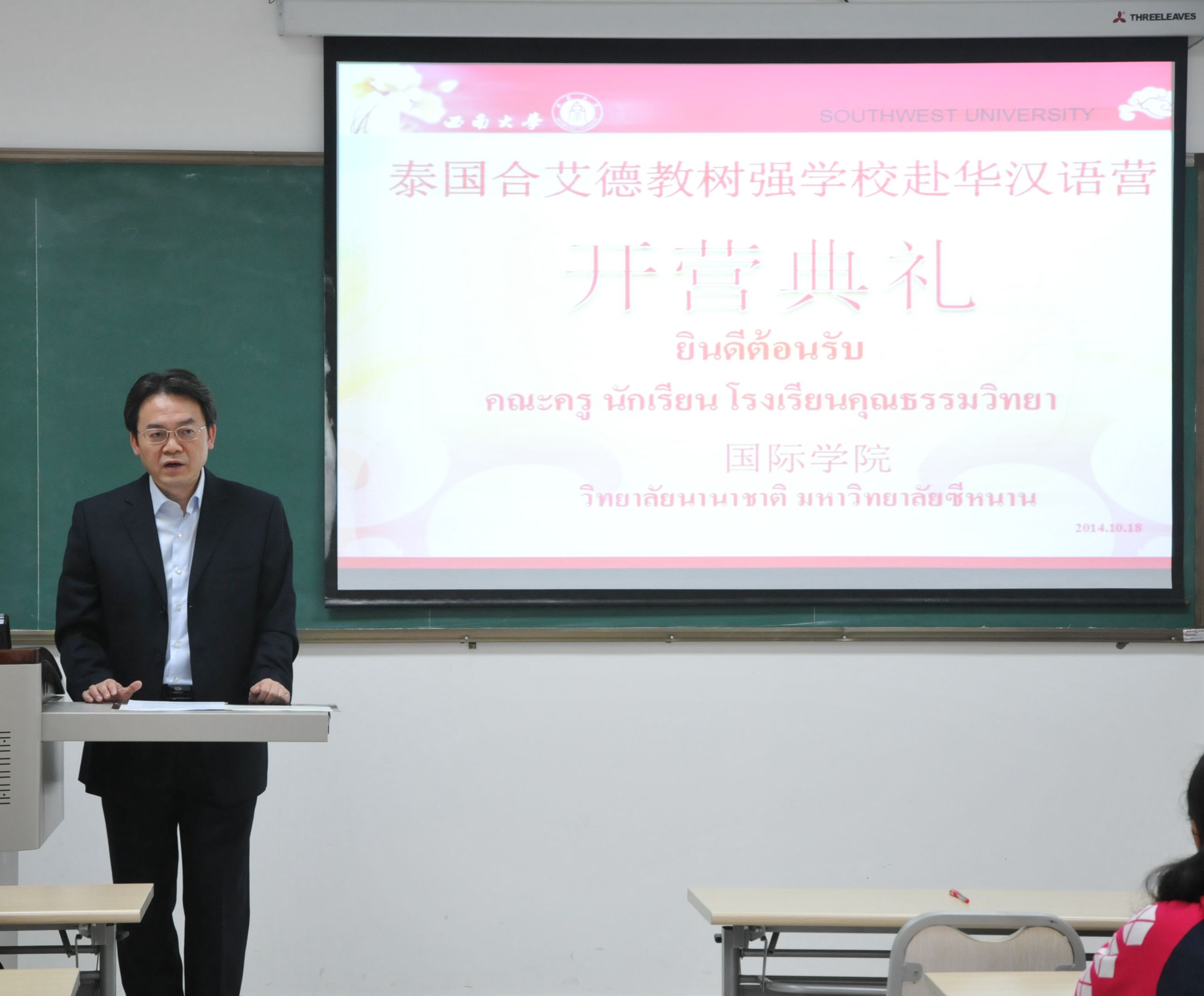 2014年10月19日,泰国合艾市德教树强学校学生赴华汉语营开营仪式在伟的国际1946bv210室举行。伟的国际1946bv党总支书记兼副院长刘猛、泰国合艾德教树强学校校长马林女士出席典礼。