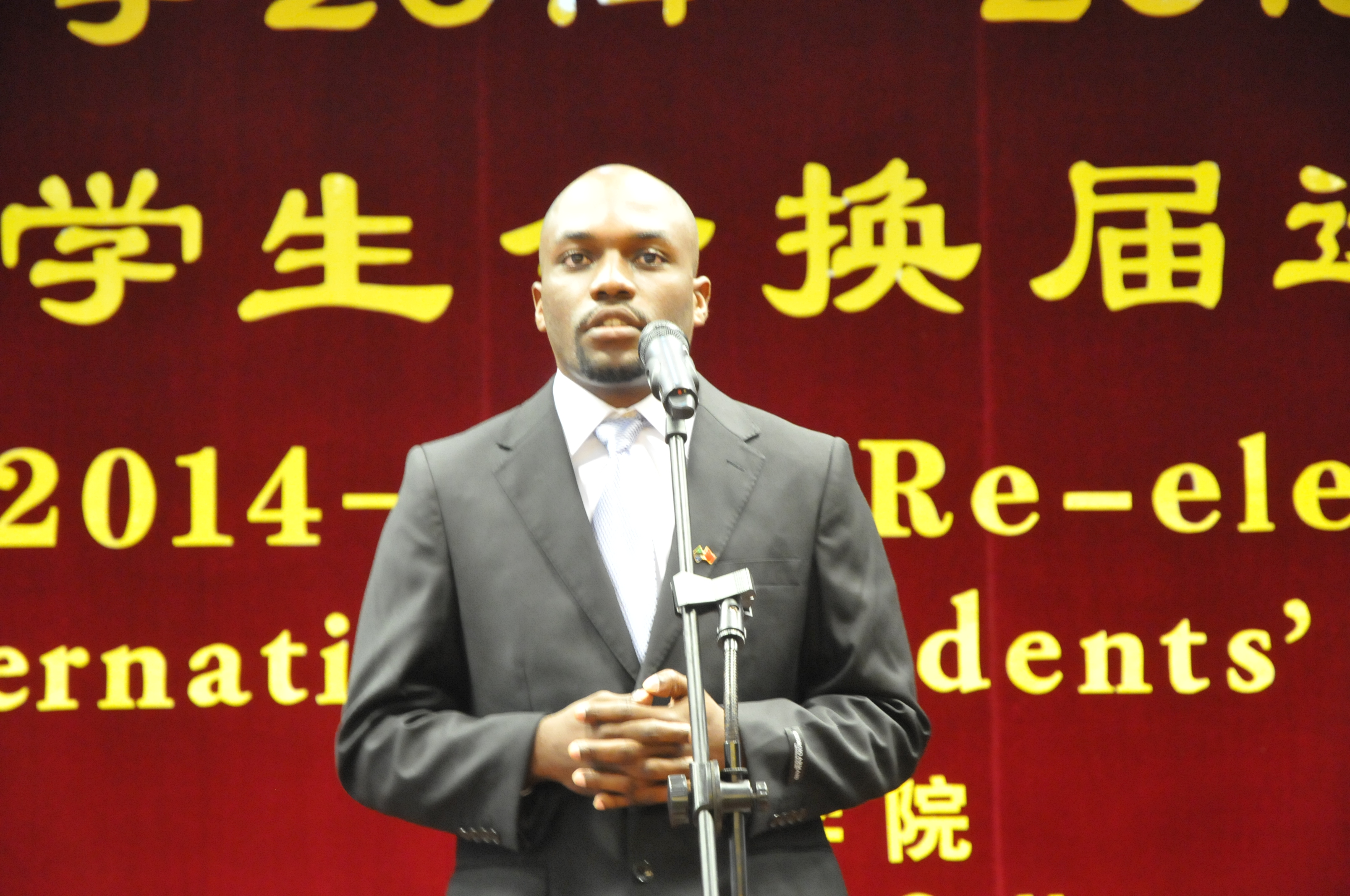 2013届留学生会主席、来自刚果(布)的美名同学对上届留学生会工作进行了总结。他特别提到留学生会要为同学们解决生活和学习方面的问题,尽全力为广大留学生服务,传达他们的心声。他希望下一届留学生会延续这一宗旨,并祝愿他们的工作取得更大成功。