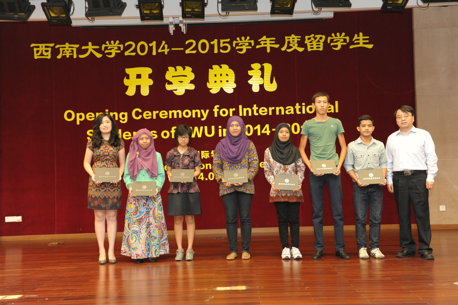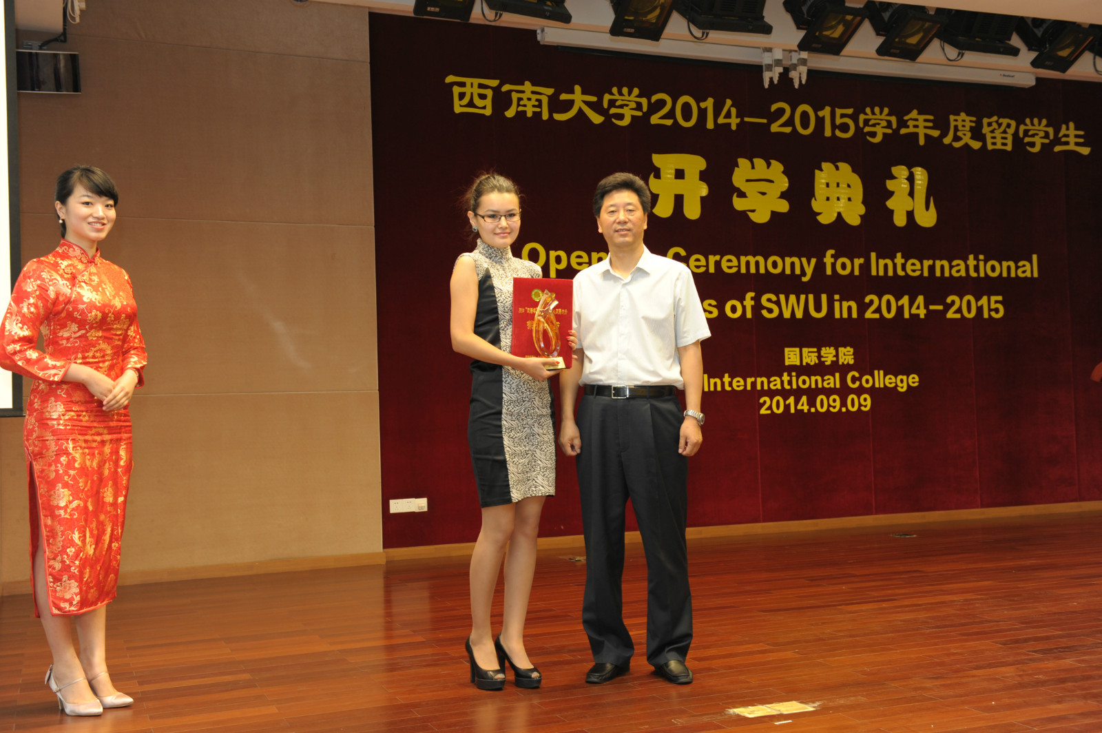 会上,靳玉乐副校长还为2014“汉语桥”全球外国人汉语大会亚军获得者、我校哈萨克斯坦籍留学生帕丽扎颁发了获奖证书和奖杯。获得2014年孔子学院奖学金的新生也上台领取了奖学金和证书。