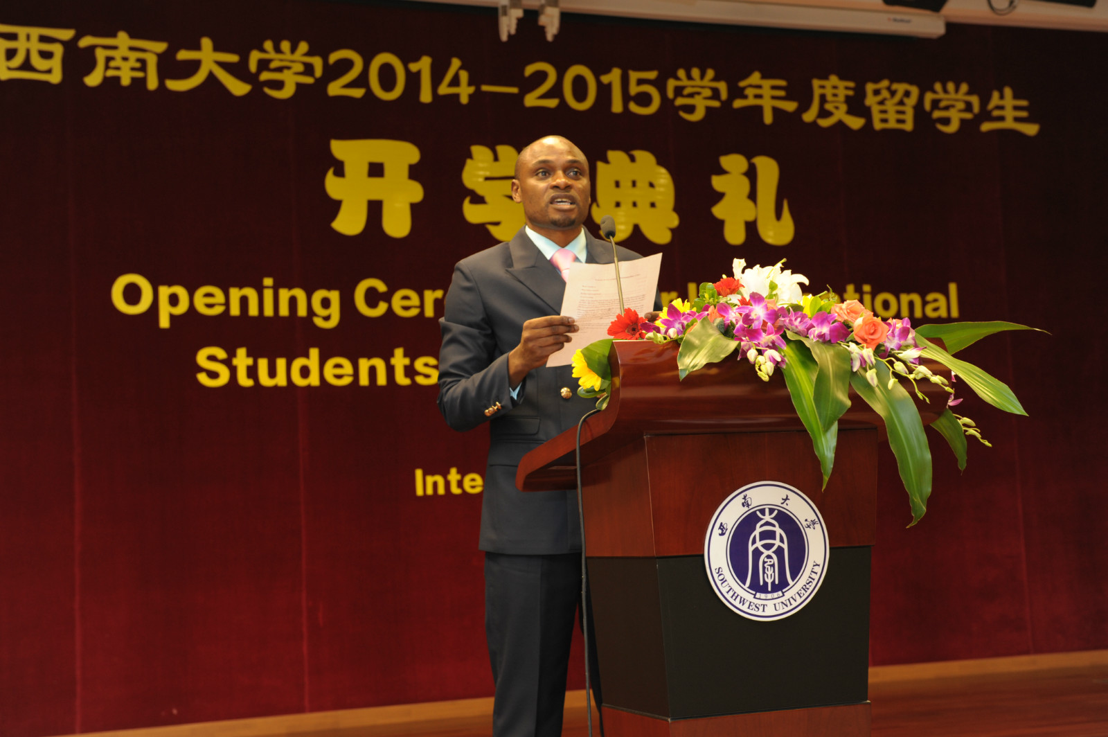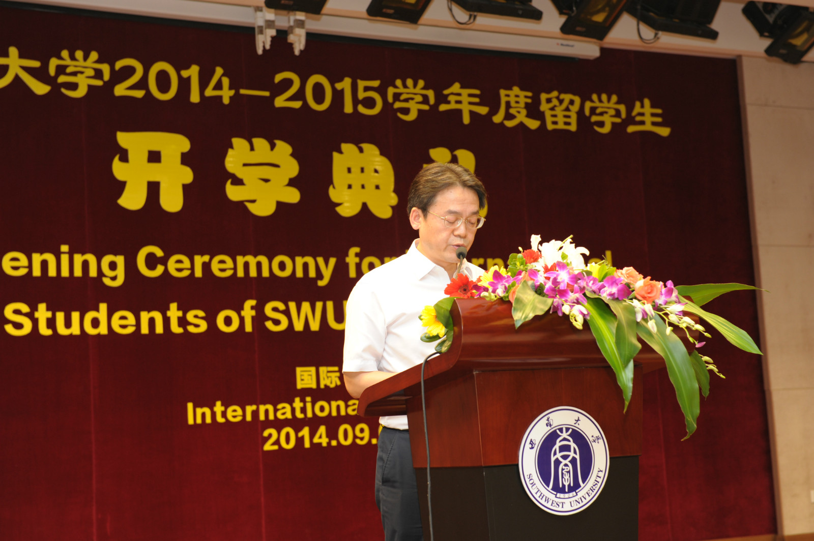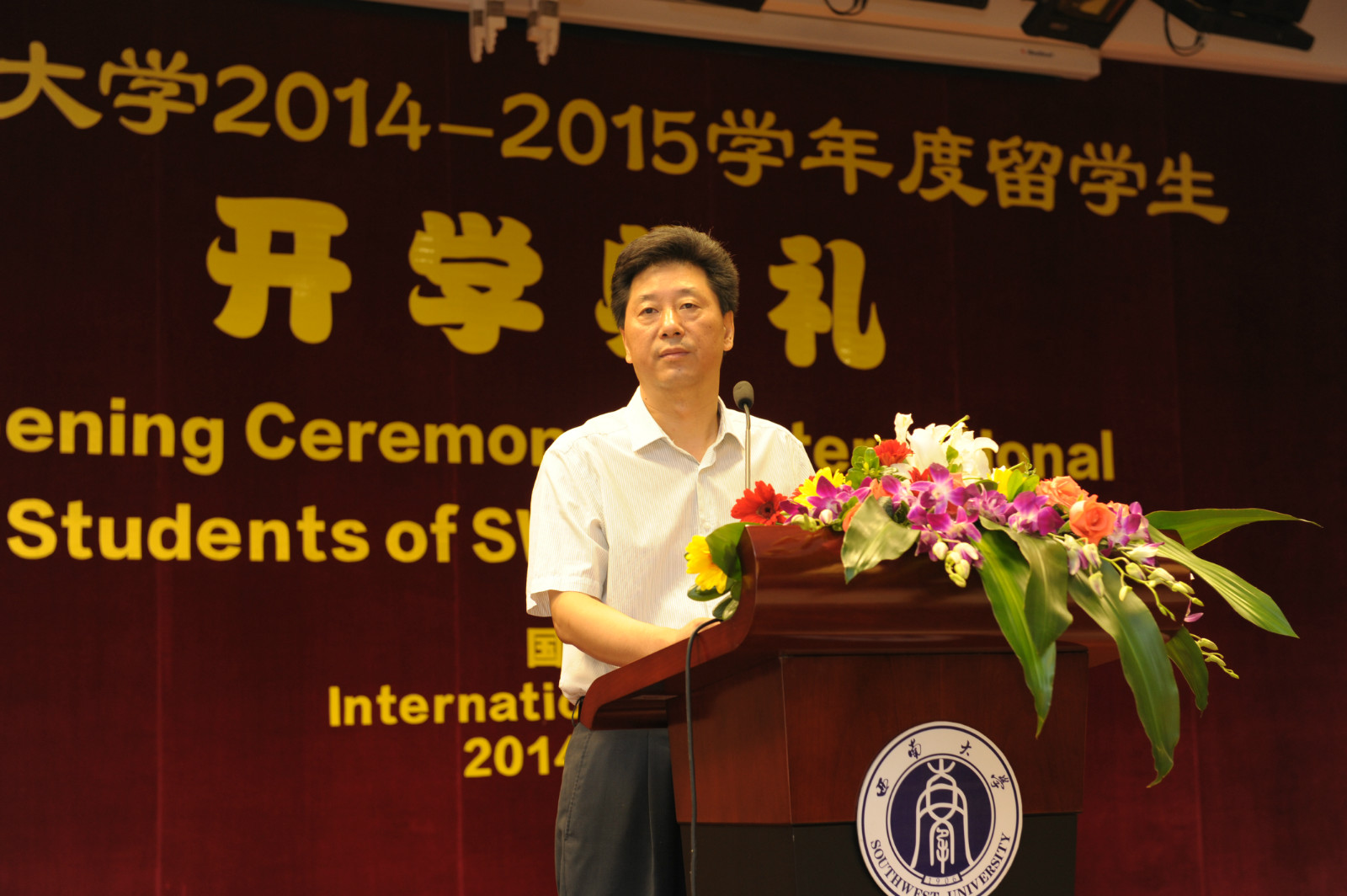 伟的国际1946bv党总支书记兼副院长刘猛代表学院欢迎来自世界各地的留学生们,他介绍了国际文化节、“汉语之星”大赛、泰国宋干节等一系列精彩纷呈的校园活动,希望大家能够遵守学校和学院的各项规章制度,早日成为一名合格的西大人。