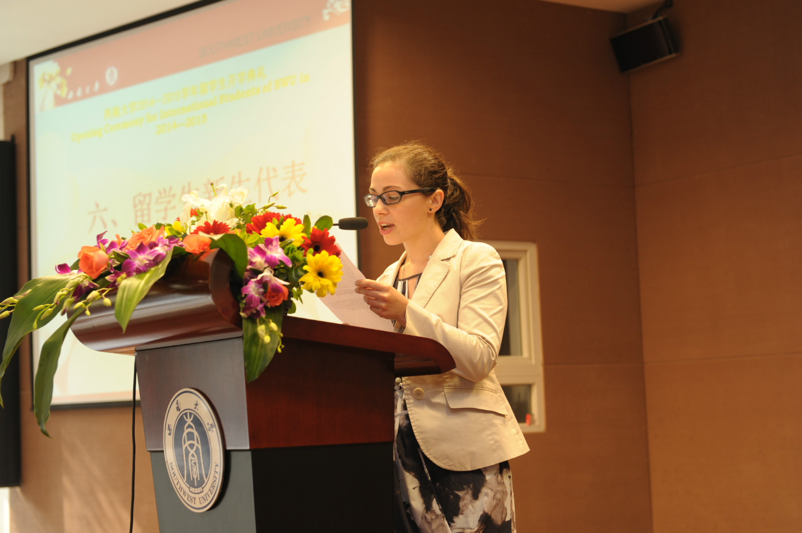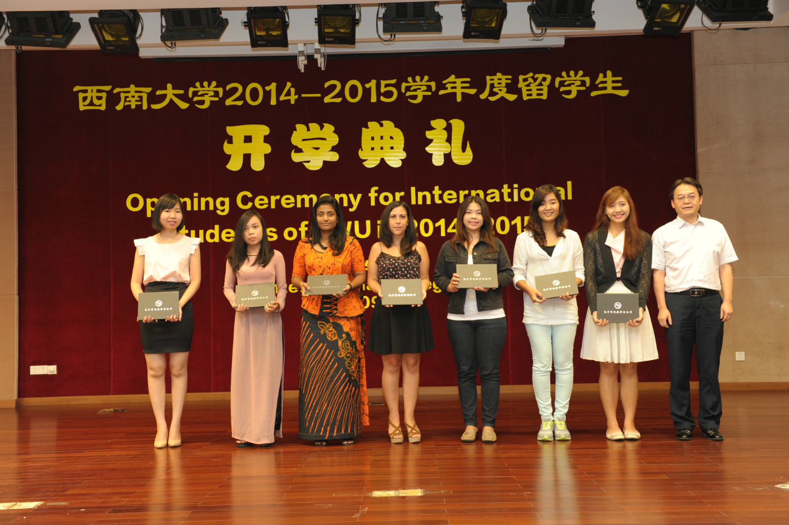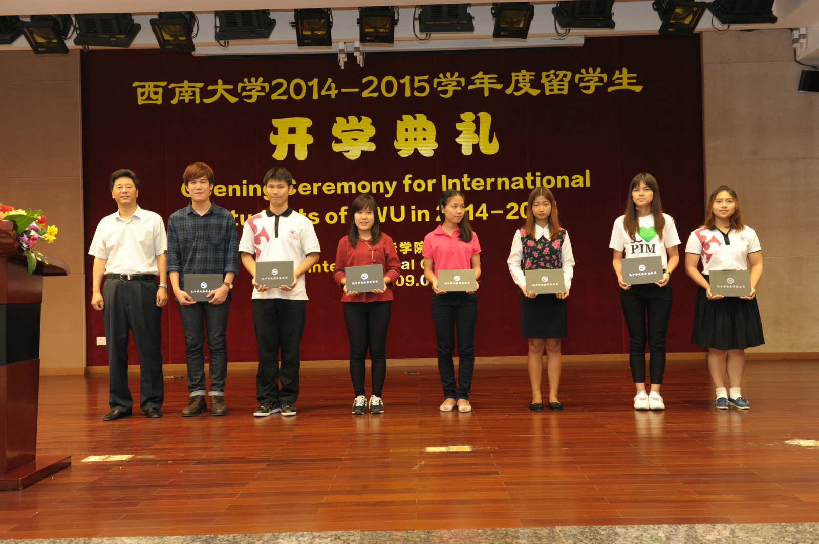 伟的国际1946bv党总支书记兼副院长刘猛代表学院欢迎来自世界各地的留学生们,他介绍了国际文化节、“汉语之星”大赛、泰国宋干节等一系列精彩纷呈的校园活动,希望大家能够遵守学校和学院的各项规章制度,早日成为一名合格的西大人。