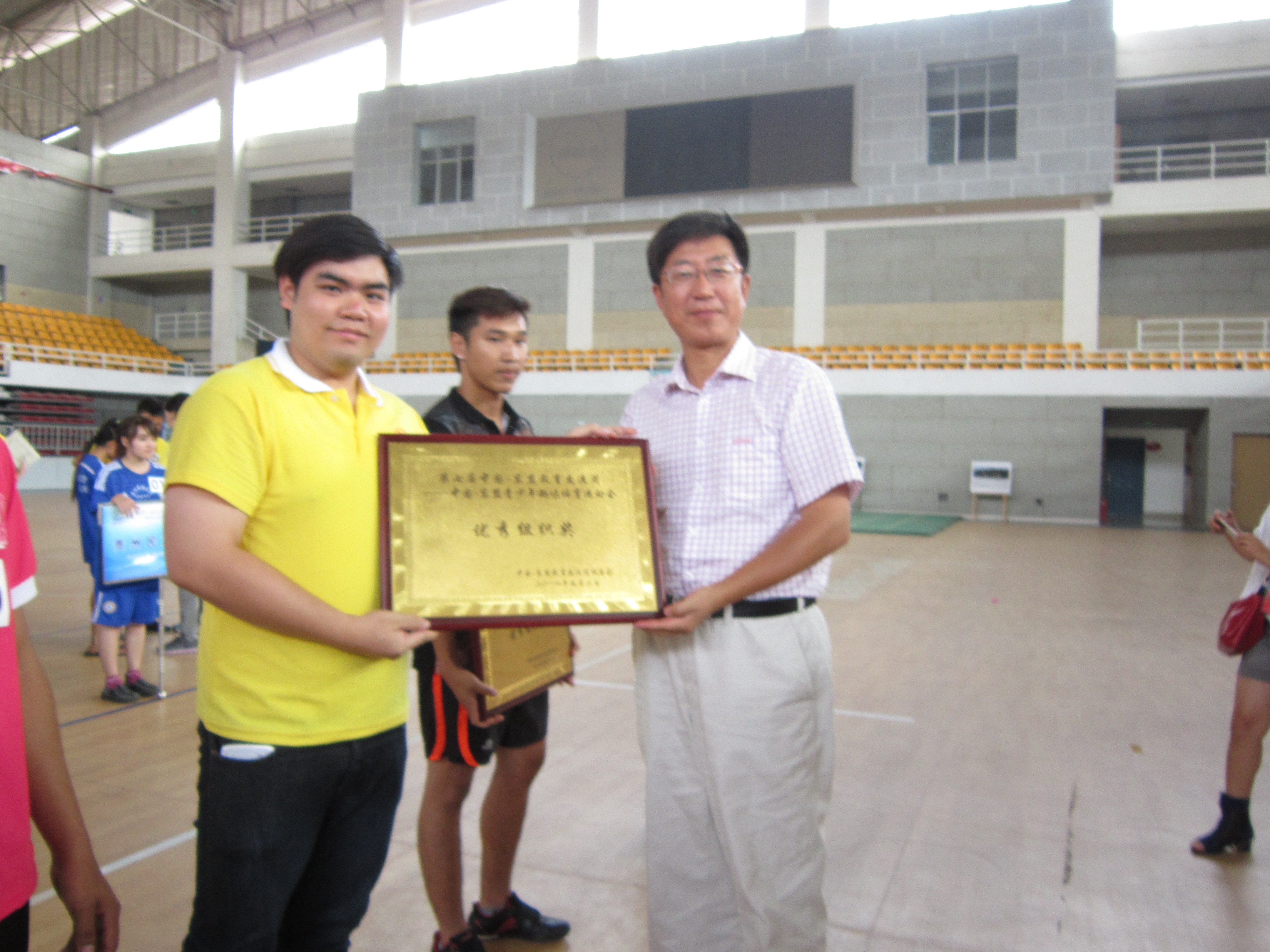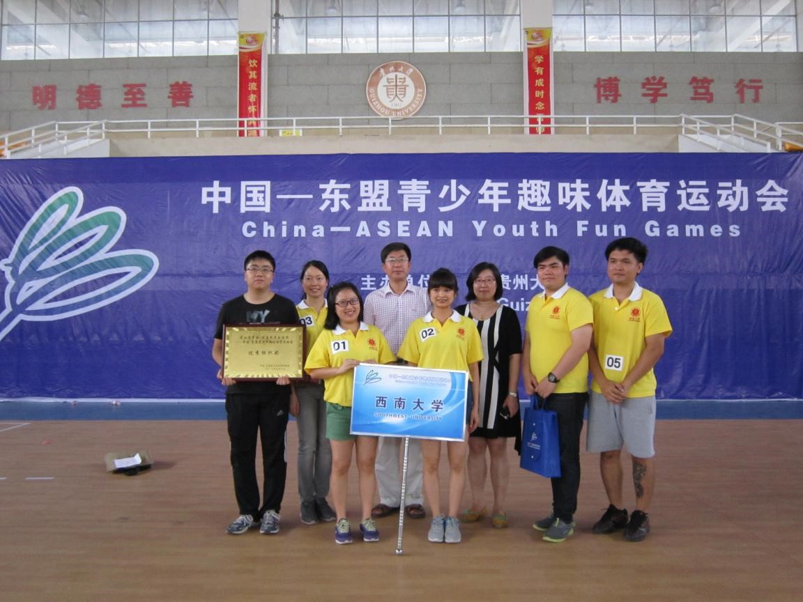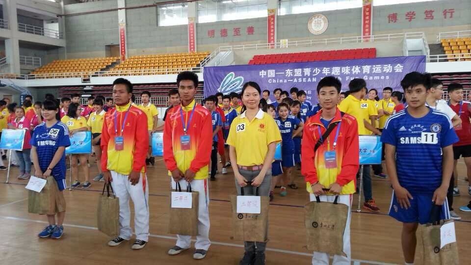 趣味运动会中,我校5名留学生运动员和来自贵州省5所高校的东盟学生组队,完成踢毽子、跳长绳和螃蟹运球等3个项目的比赛。通过激烈的比赛,我校老挝籍学生苏学士所在的小组获得了跳绳比赛第二名,越南籍学生李嘉燕所在的小组获得了跳绳比赛第三名,泰国籍学生罗俊勇所在的小组获得了螃蟹运球比赛第三名。教育部学生体育协会联合秘书处副秘书长薛彦青为我校颁发了优秀组织奖。
