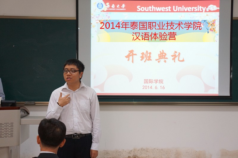 2014年6月16日上午18:00在伟的国际1946bv紫云楼312教室隆重举行了2014年泰国职业技术学院汉语体验营开营典礼。出席开营典礼的有伟的国际1946bv副院长张家政、招生办公室主任代远鸿、学院办公室主任邹育艳,学院教师代表徐心三老师,以及汉语体验营的23名学员和3名泰方教师。